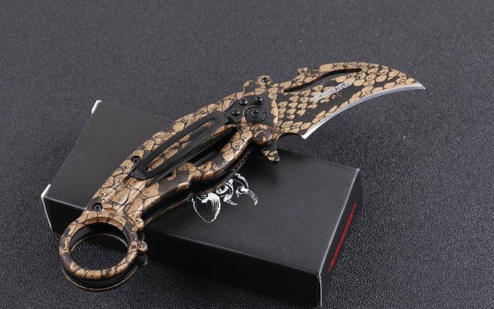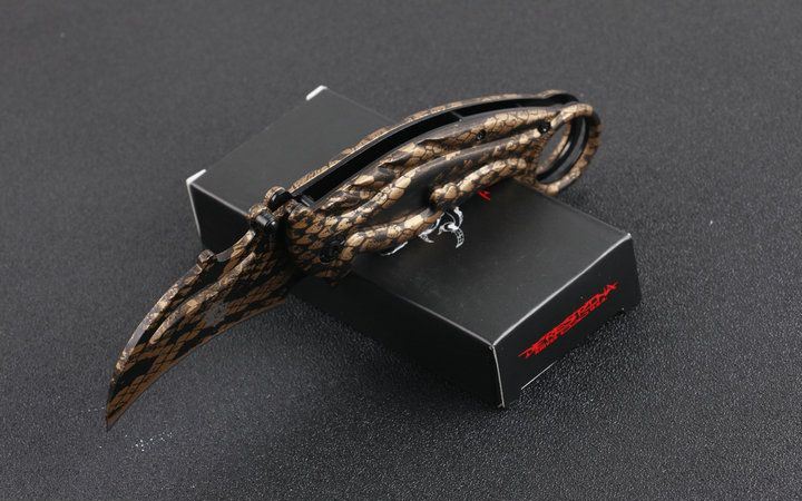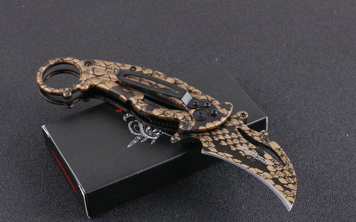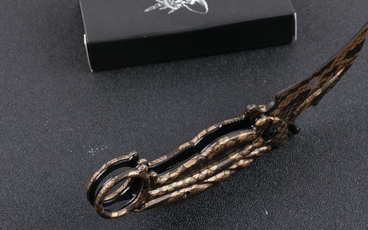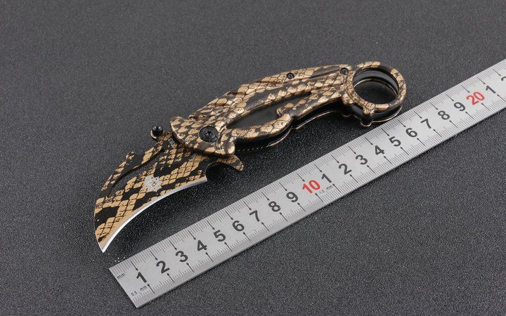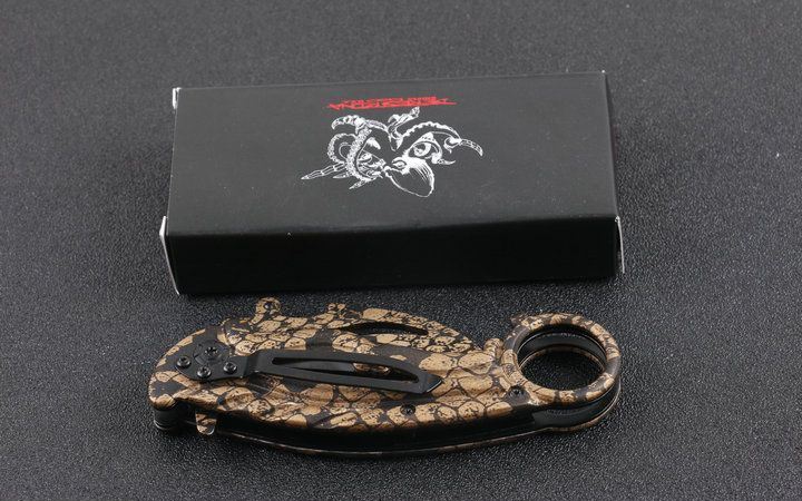披覆X63爪刀 全长:17.2cm 刃长:6.5cm 柄长:11.5cm 刃厚:0.29cm 刃宽:3.0cm 刃材:5CR15MOV 柄材:全钢片 硬度:57HRC 净重:148克(含包装) 锁定:线锁 表面处:披覆 其他:原厂彩盒