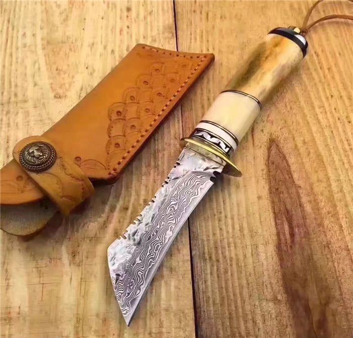 大马士革战车猎手收藏刀 全长:23.5cm 刃长:11cm 厚度:3.6mm 柄长:12.5cm 硬度:59-60HRC 钢材采用:锻打大马士革钢、刀刃背部15段齿牙打磨而成 手柄材料做工:护手采用纯黄铜+白铜刻花+天然牛骨+隔片G10、尾部白钢可穿皮绳等,整刀做工细腻,特配手工版高档牛皮刀套