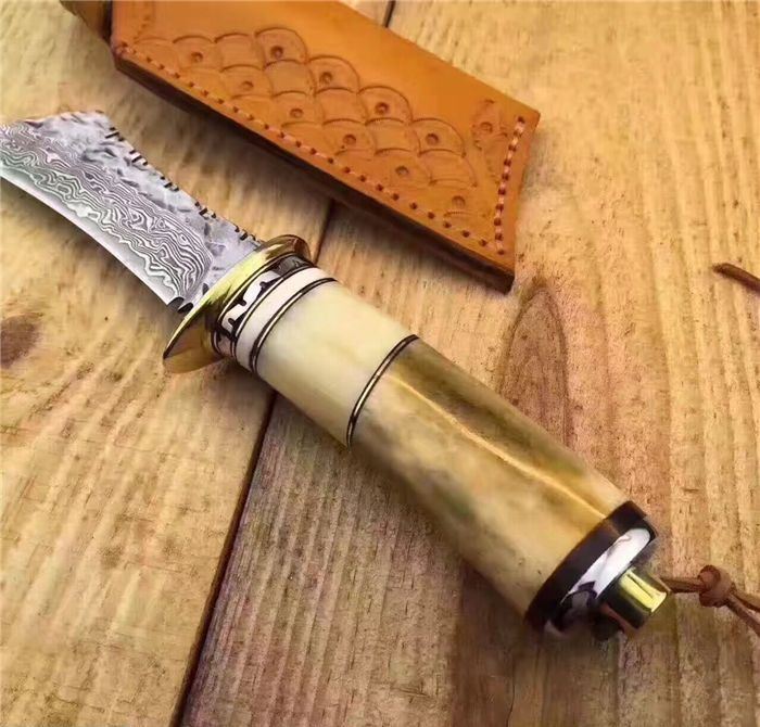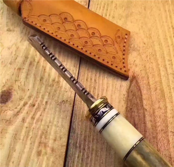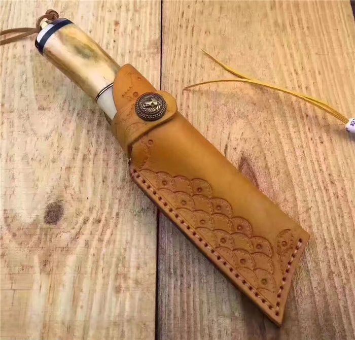 手柄材料做工:护手采用纯黄铜+白铜刻花+天然牛骨+隔片G10、尾部白钢可穿皮绳等,整刀做工细腻,特配手工版高档牛皮刀套