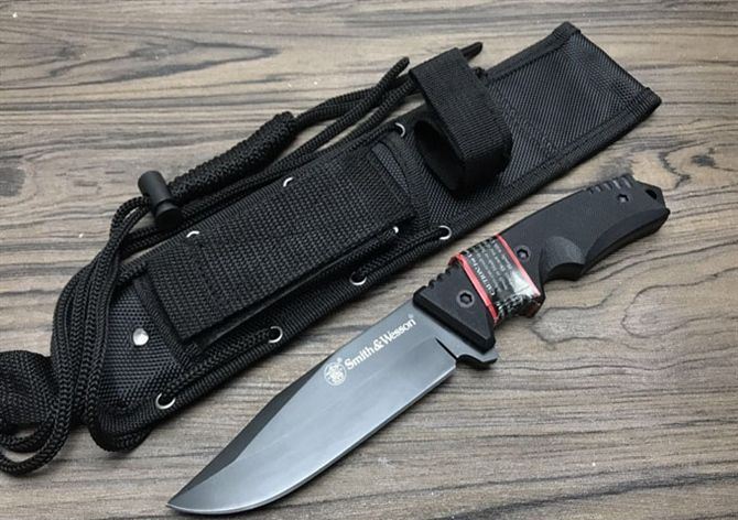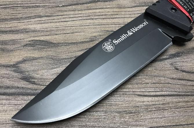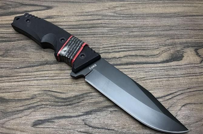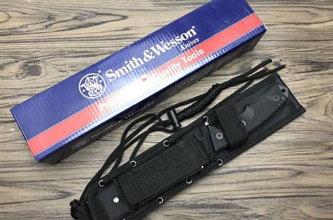 史密斯.威森SWF2匕首 全长:25.3mm 刃长:12.3mm 柄长:130mm 刃宽:34mm 刃厚:5mm 刃材:8Cr14Mov 重量:500g(含包装) 硬度:58HRC{真空热处理) 表面:黑钛 柄材:G10 刀鞘:尼龙