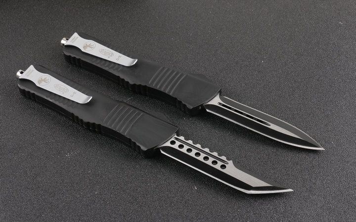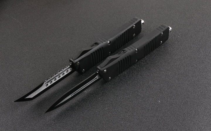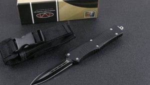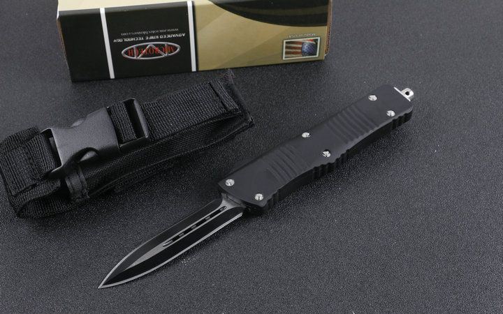 微技术D2双锋头直出刀黑色 全长:24.0cm(含尾锥长度) 刃长:9.5cm 刃厚:3mm 刃材:440 硬度:57HRC 总重量:342.0克(含包装物) 表面:黑白拉丝(刀刃) 柄材:锌铝合金 刀鞘:尼龙 锁闭:弹簧直出 备注:带背夹