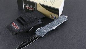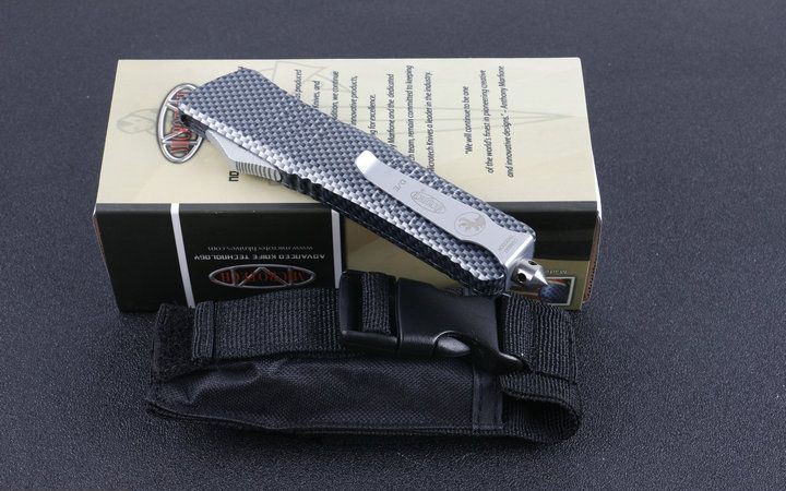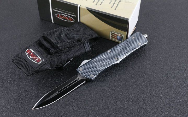 微技术D1双锋头碳纤纹直跳刀 全长:24.0cm(含尾锥长度) 刃长:9.5cm 刃厚:3mm 刃材:440 硬度:57HRC 总重量:342.0克(含包装物) 表面:黑白拉丝(刀刃) 柄材:锌铝合金 刀鞘:尼龙 锁闭:弹簧直出 备注:带背夹
