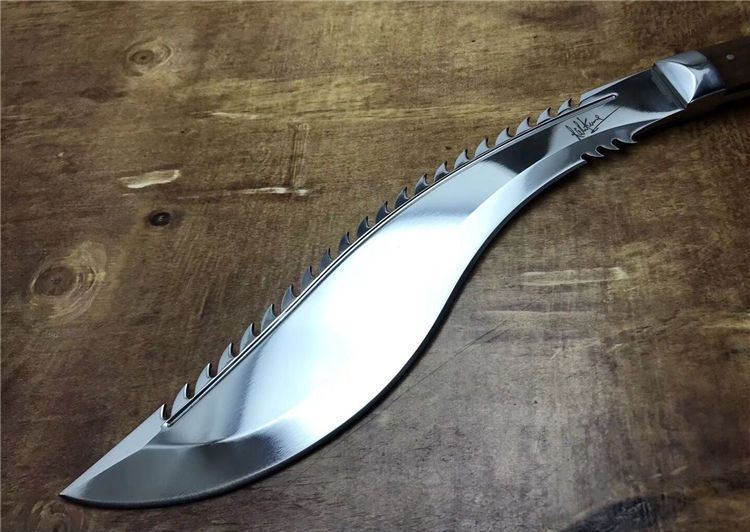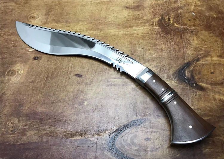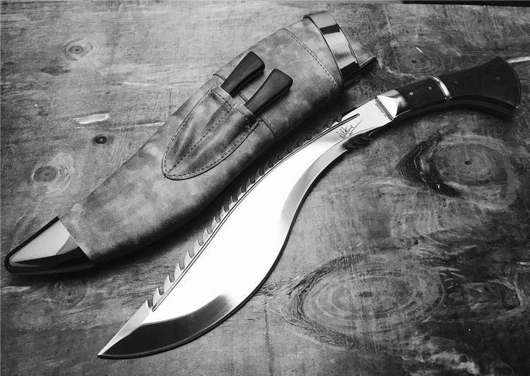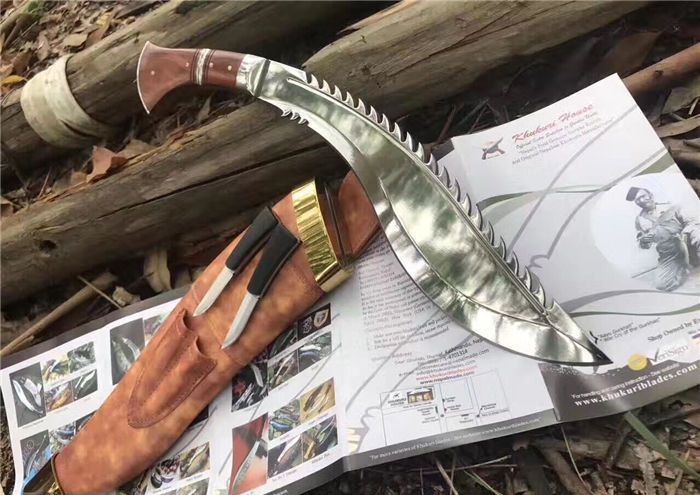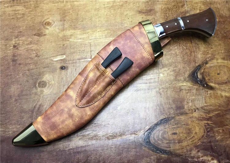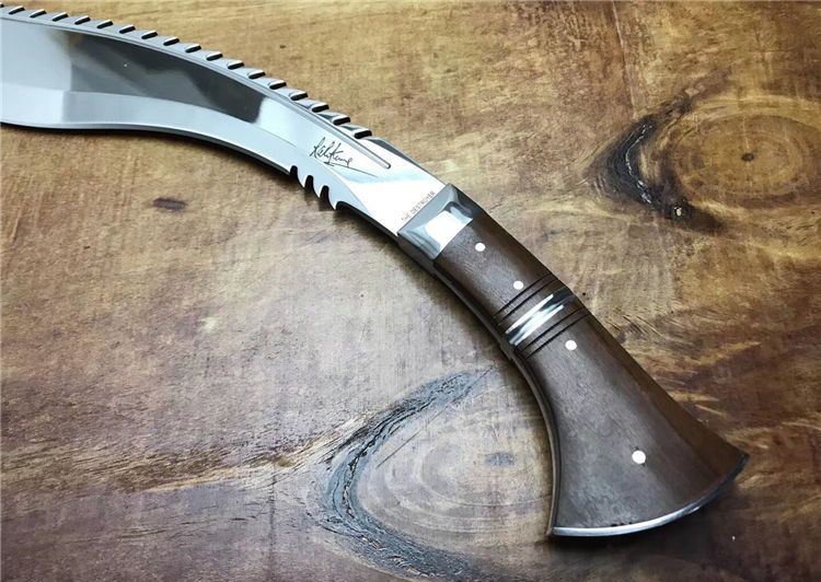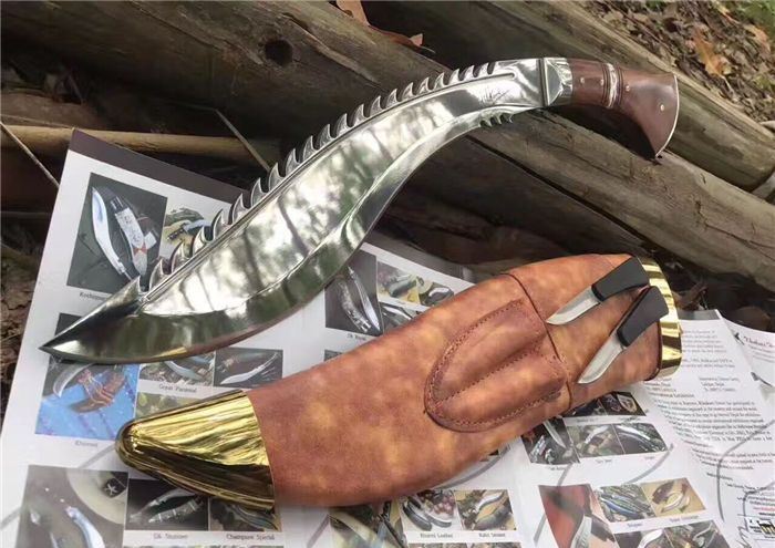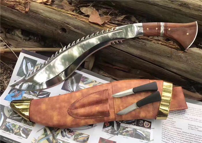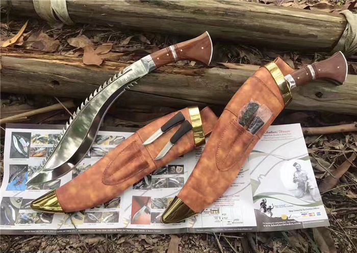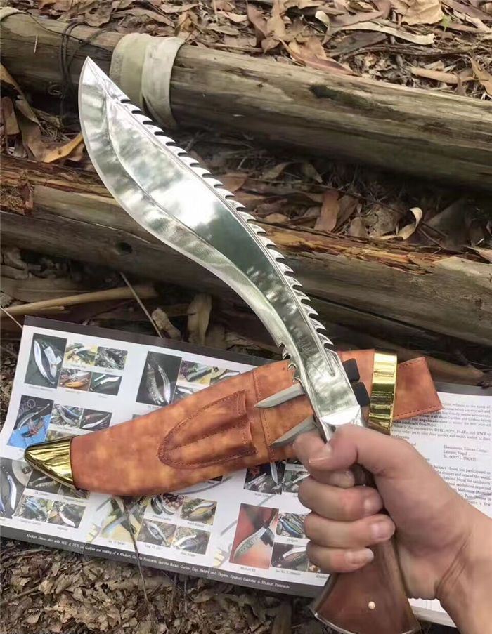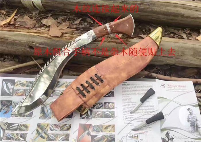 高品质廓尔喀毁灭者狗腿刀 全长:46cm 厚度:0.6cm 刃宽:6cm 硬度:60C 刃材:9Cr18M0V 柄材非洲小叶檀木 全刃,镜光,附真皮刀套,彩盒及说明书