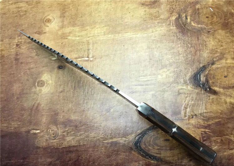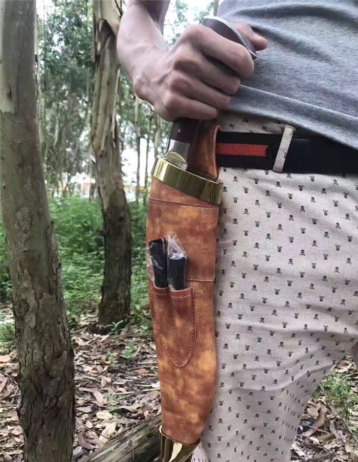 全长:46cm 厚度:0.6cm 刃宽:6cm 硬度:60C 刃材:9Cr18M0V 柄材非洲小叶檀木 全刃,镜光,附真皮刀套,彩盒及说明书