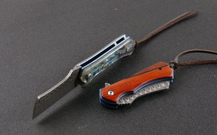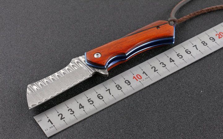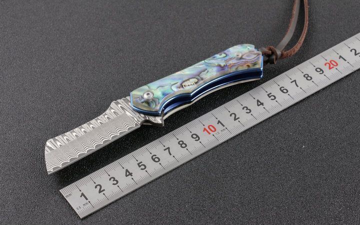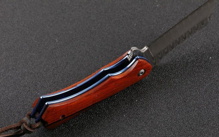大马士革无敌战士折刀 全长:16cm 刀刃:7cm 刃厚:0.32cm 刃宽:2.5cm 柄长:9.0cm 硬度:58HRC 净重:200g(含包装物) 材料:VG10大马士革钢 柄材:蓝钛钢片+(天然微粒红檀木+天然鲍贝)下单要注明 锁型:线锁 包装:黄色高档木盒+尼龙套