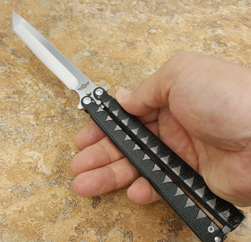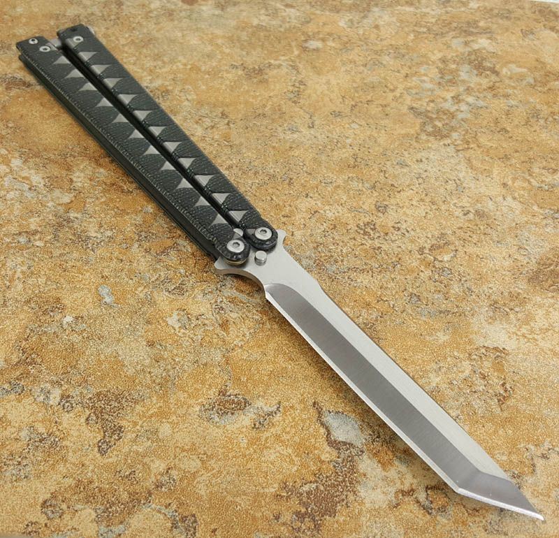 The one精品武士蝴蝶甩刀 全长 25.3 刃长 11.4 刃厚 0.38 刃材 440C 柄材 钢柄,激光缠绳纹 柄长 13.8 重量 150克 Theone精品武士蝴蝶甩刀,创意武士刀款型!Tanto武士刀刃,拉丝配缎光440C锋刃, 武士刀缠绳柄纹理钢柄,秉承Theone 优质血统