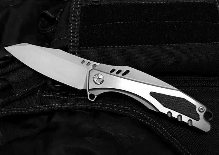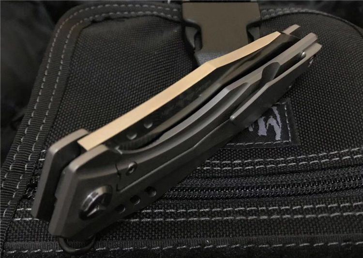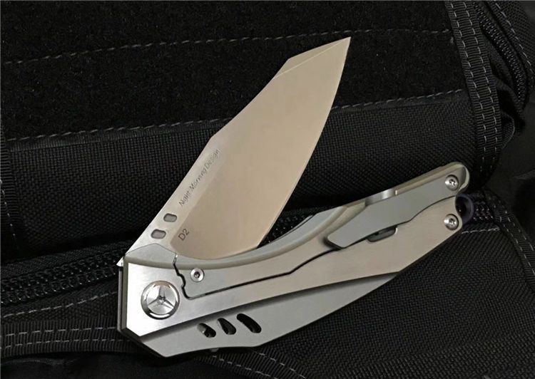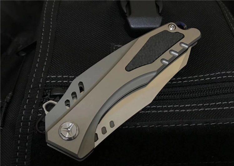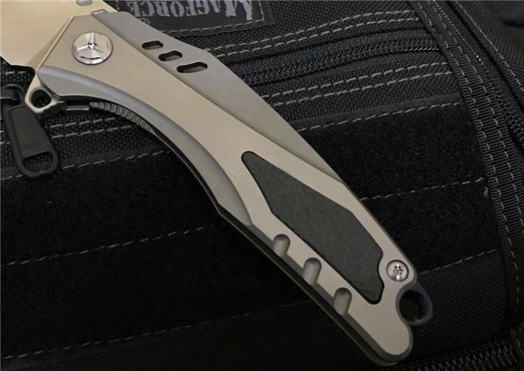 最新的拔手钉快开方式,开合更加顺畅,全钛刀柄,;刀片采用D2材料,全手工打磨,线条流畅;最高要求的精准的外六角止位钉,更显工艺高超;内嵚式合金锁位片,使刀柄表面光滑,给人最美观感!这就是全新的