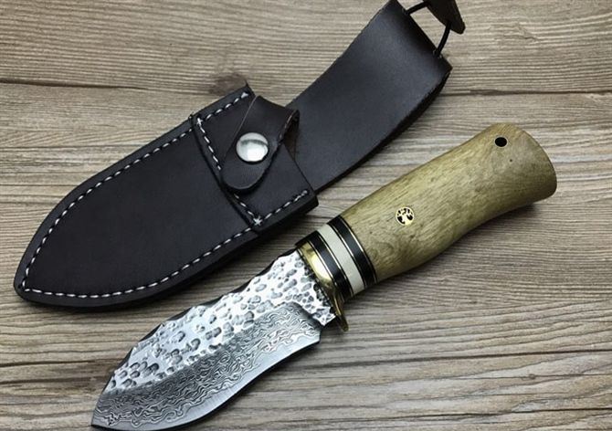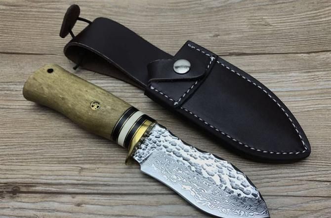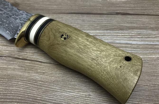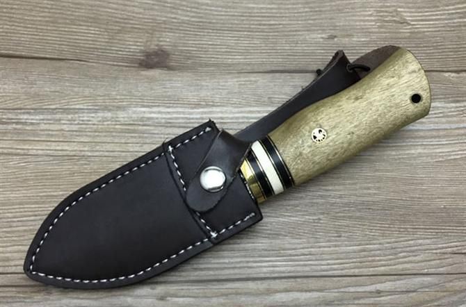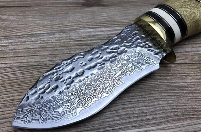 壮勇大马士革直刀 全长:22.2cm 刃长:11cm 刃宽:3cm(最宽处) 刃厚:4.4mm 柄长:11.2cm 表面:锻打大马士革本色花纹 刃材:大马士革钢 硬度:59HRC 柄材:白影木 重量:400克(含包装) 包装:皮套、纸盒 其他:刃口锋利大马士革钢花纹和把手木纹及颜色各异,以实物为准