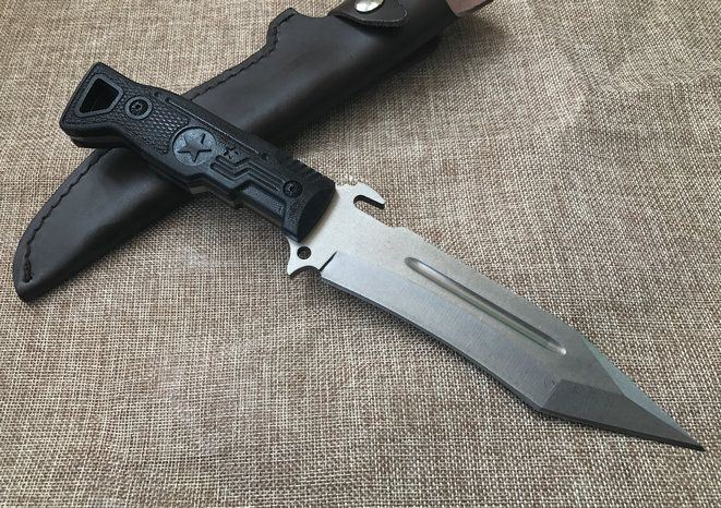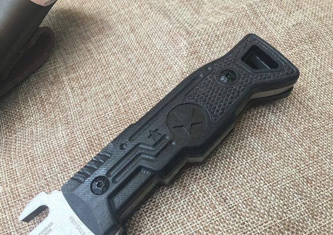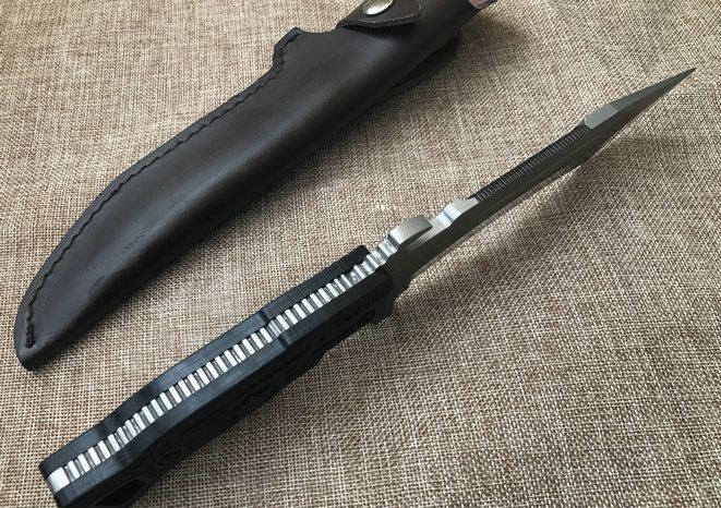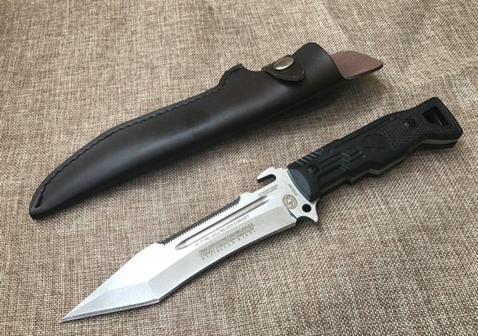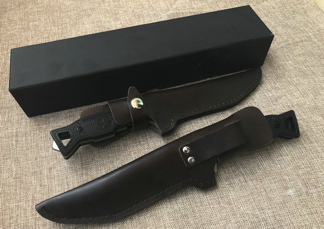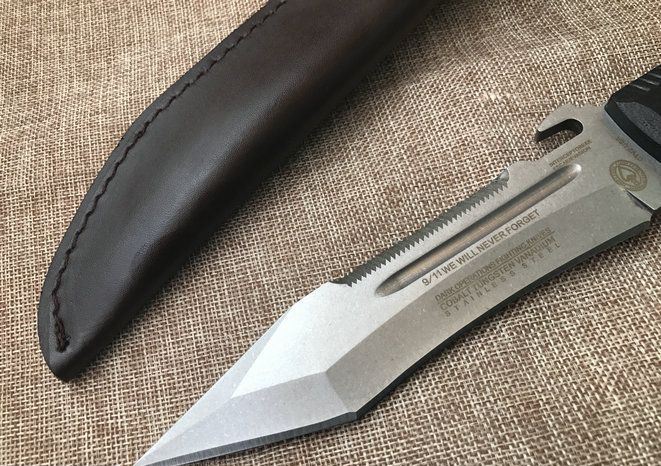 夜魔911T头16周年纪念版 全长:29.8cm 刃长:17.1cm 柄长:12.7cm 刃宽:5.1cm 刃厚:0.6cm 刃材:D2 重量:520g(含包装) 硬度:60HRC 表面:石洗 柄材:G10 其他:皮套