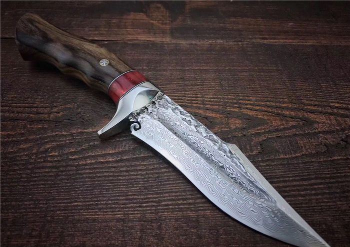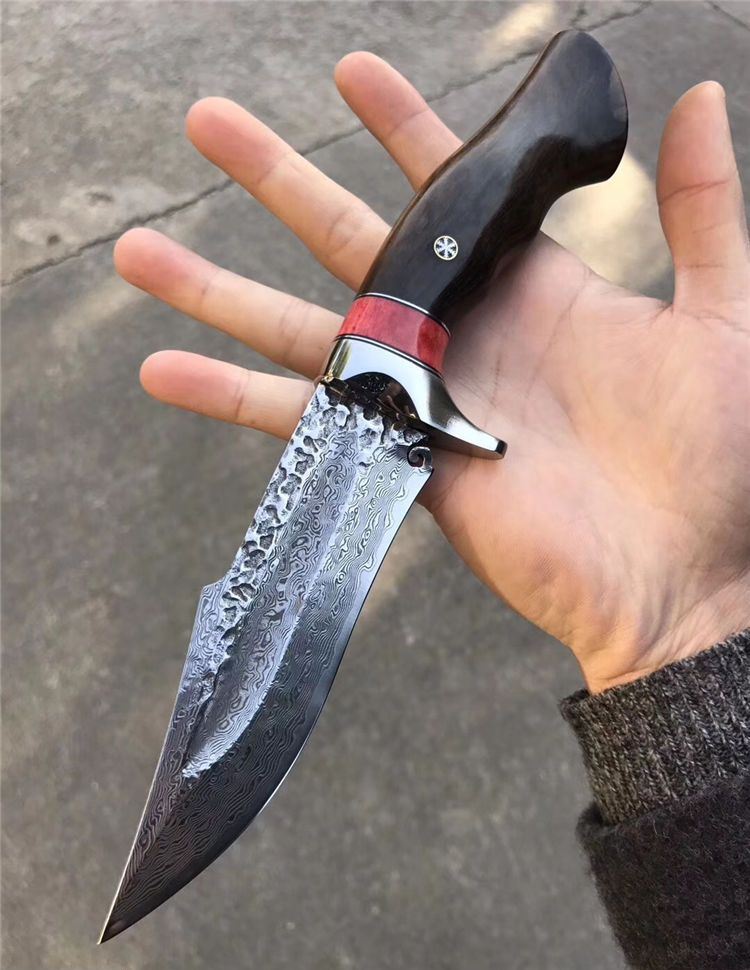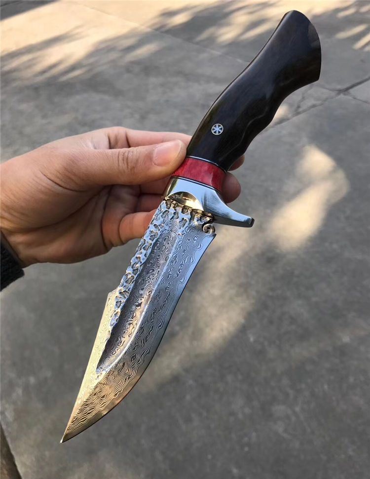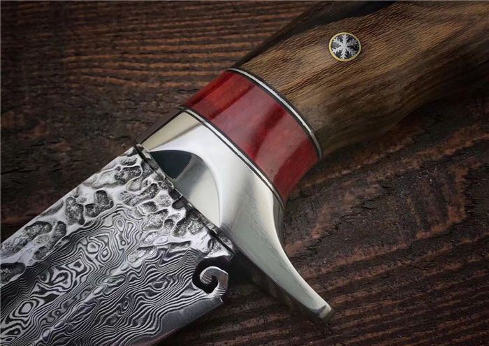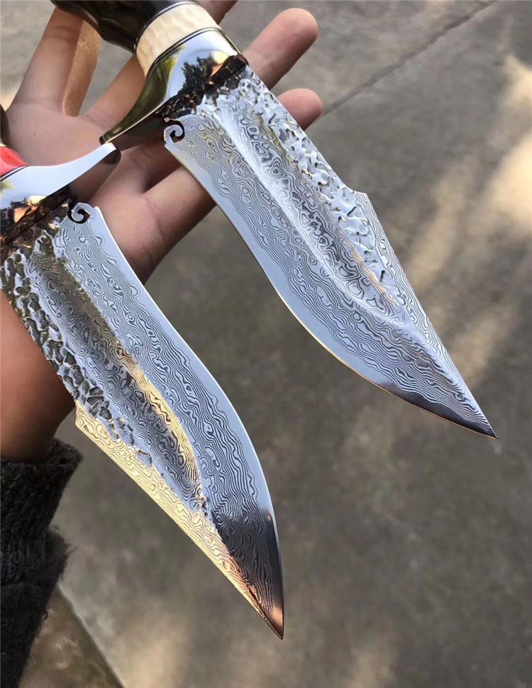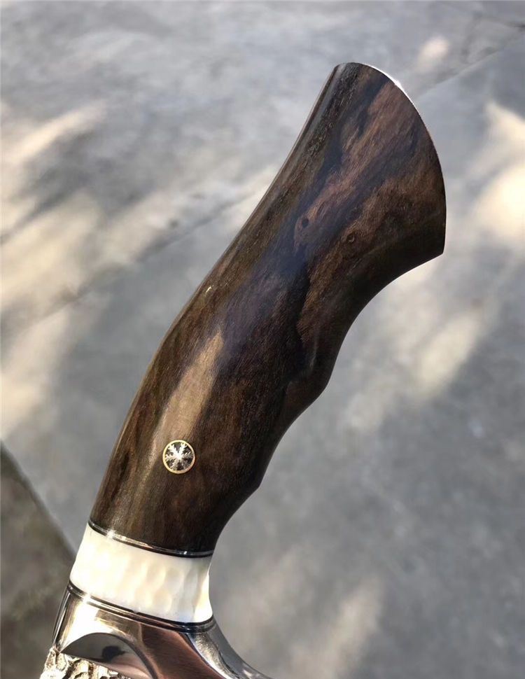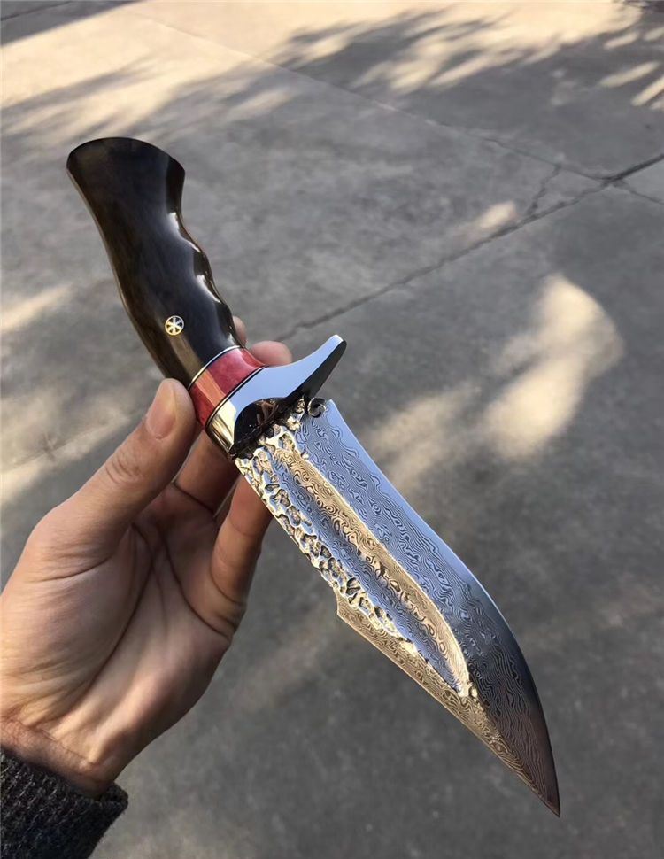 全长:25cm 刃长:12cm 钢材:大马士革钢 刃宽:3.5cm 刃厚:4mm 硬度:60HRC、真空热处理 手柄材料:进口影木黑檀+红骆驼骨+牛骨 重量:195.8g(净重) 包装:高端精致礼品盒 做工非常出色、佩戴/高端纯手工意大利缝线刀套