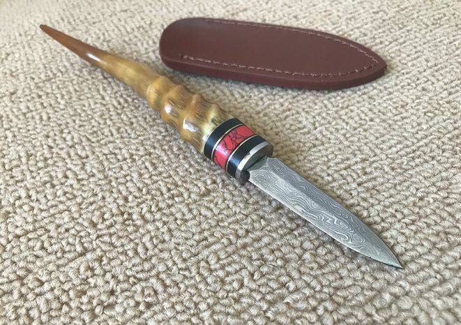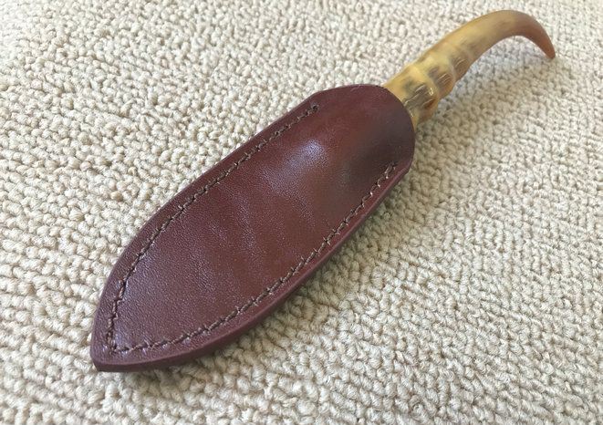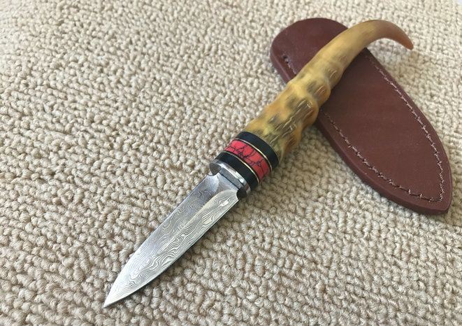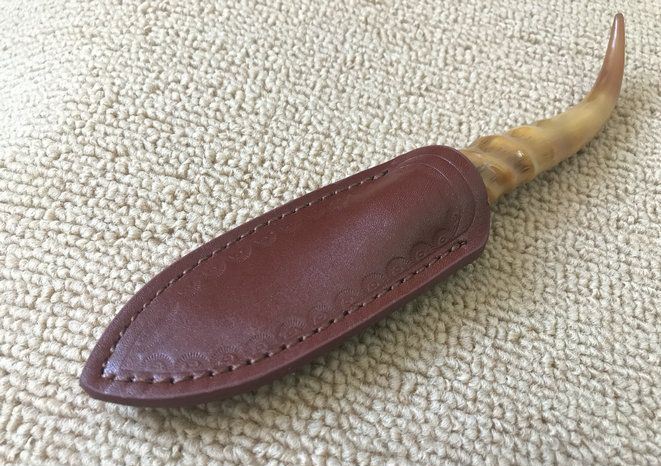 大马士革黄羊角茶刀 全长:19cm 茶刃长:6cm 钢材厚度:2.5mm 茶刃钢材:大马士革钢 硬度:59HRC 手柄材料:天然黄羊角