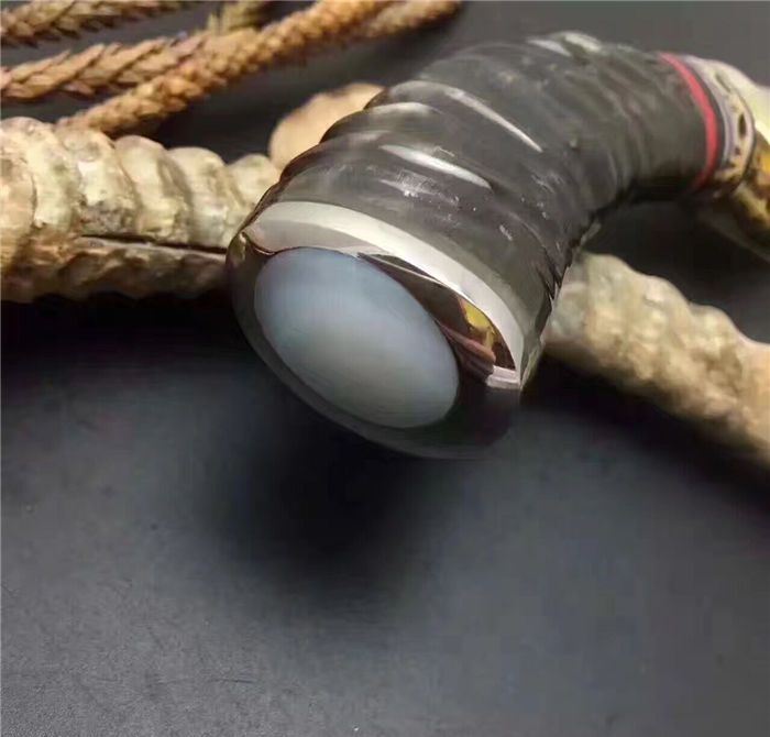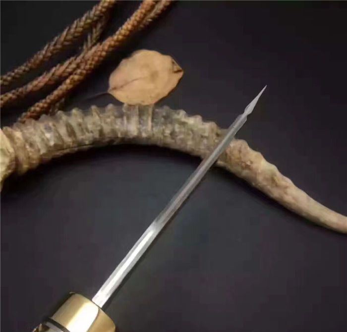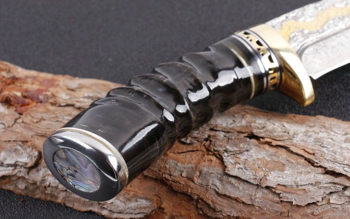 柄材:野生黄羊角+护手纯铜,柄尾部精镶天然鲍贝。