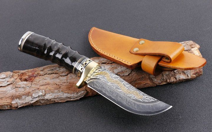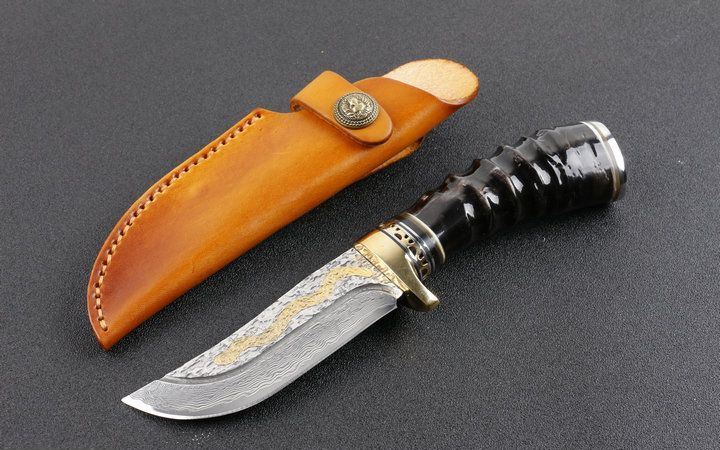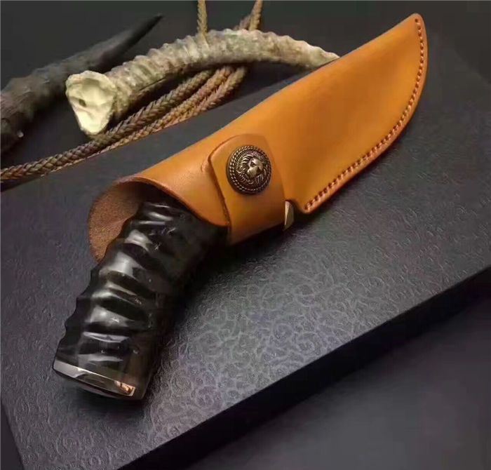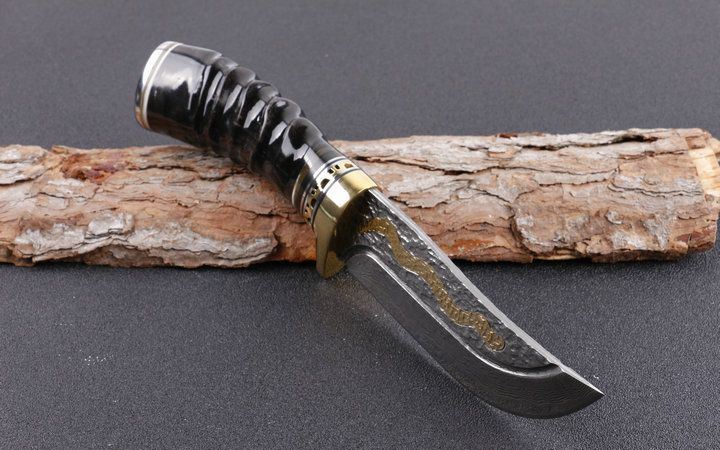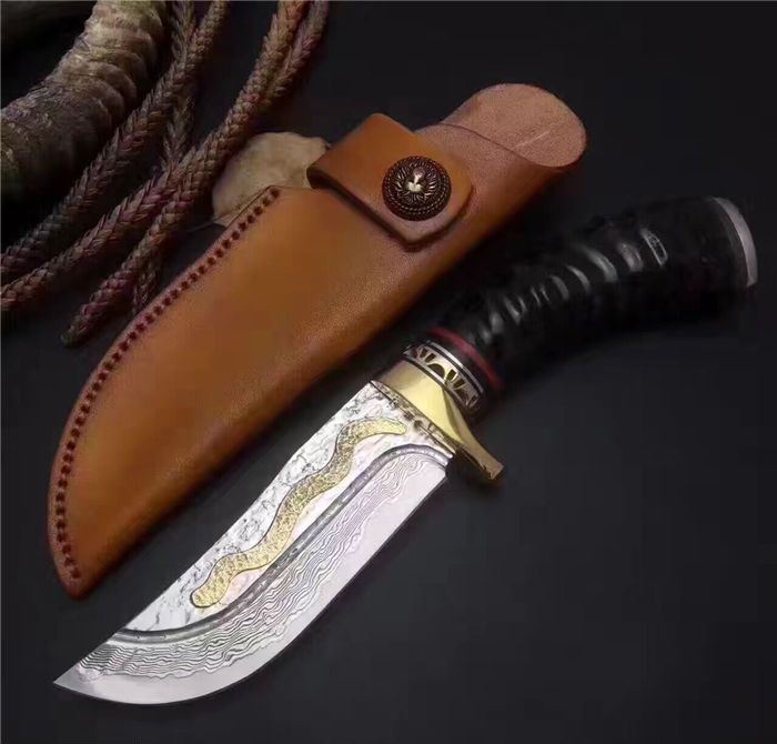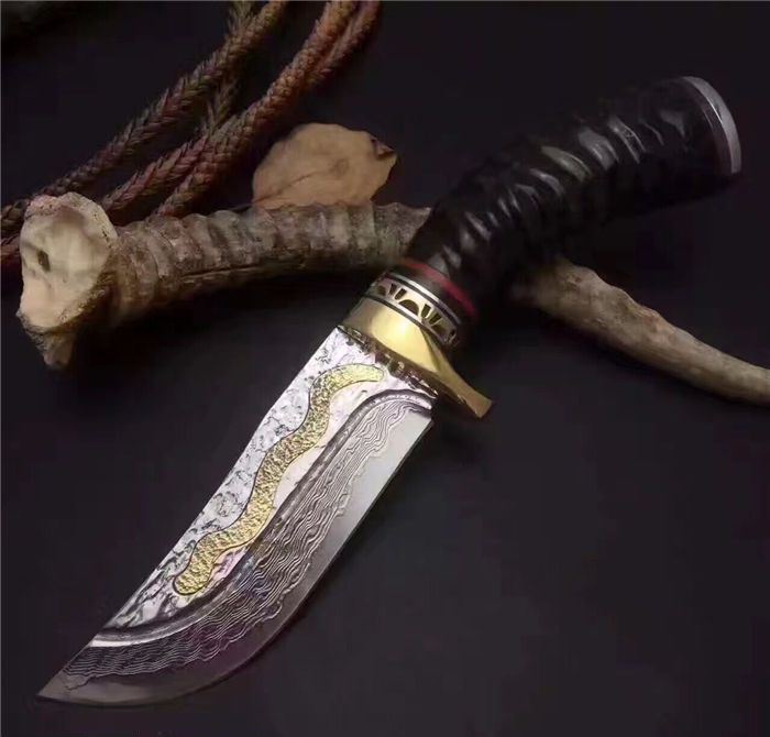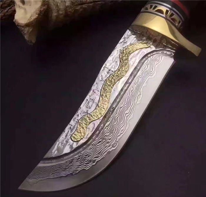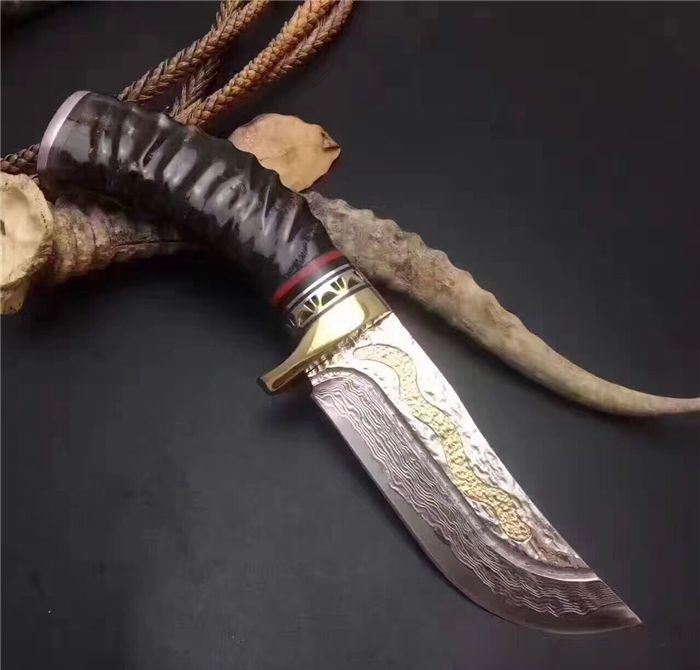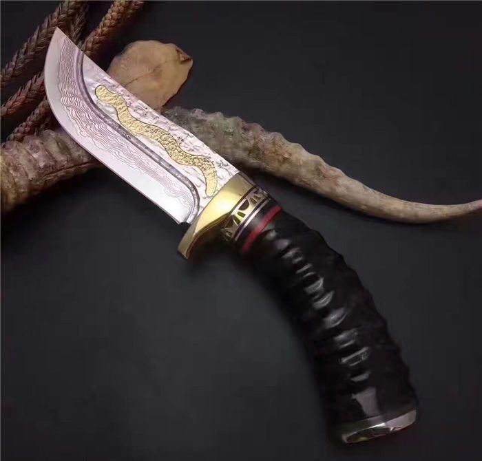 大马士革金龙飞舞限量版直刀 全长:23.5cm 刃长:11.5cm 柄长:12.0cm 刃宽:3.6cm(最宽处) 硬度:58HRC 刃厚:0.45cm 柄材:野生黄羊角+护手纯铜,柄尾部精镶天然鲍贝。 重量:595克(含包装) 刃材:锻打大马士革钢,内镶全黄铜小龙子。 表面:大马士革钢特有的花纹原色 其他:配高档礼品盒.全手工意大利真皮套. 大马士革钢花纹和把及颜色各异,以实物为准!