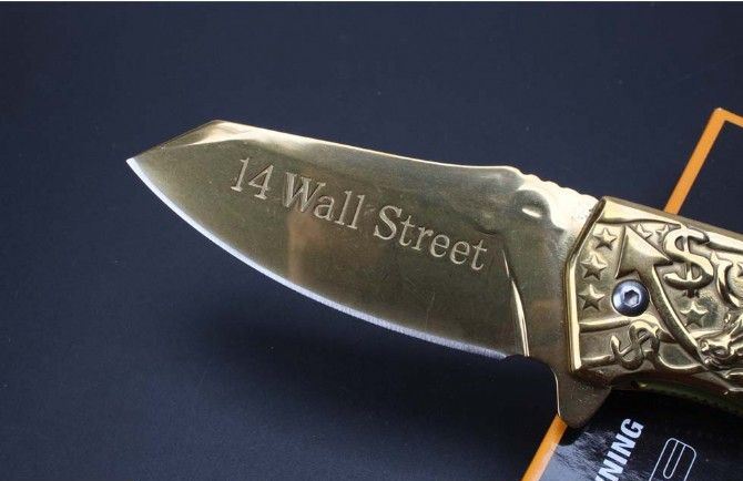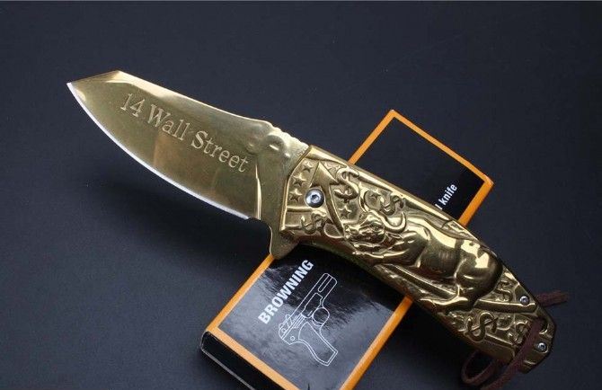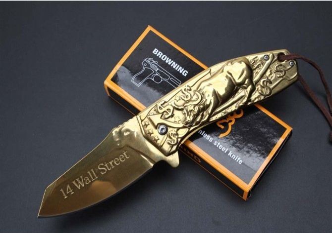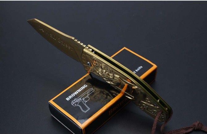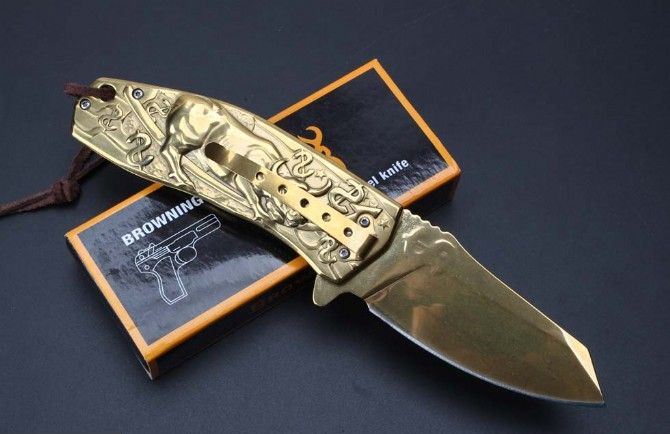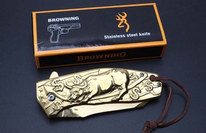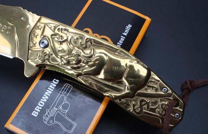 勃朗宁五福金牛快开折刀 全长:20.9cm 刃长:9.1cm 柄长:12.0cm 刃宽:3.7cm 刃厚:2.5cm 刃材:440 重量:276g(含包装) 硬度:58HRC 表面:镀金 柄材:全钢扎花.图案凸起非常美观实用 锁型:侧锁 其他:彩盒