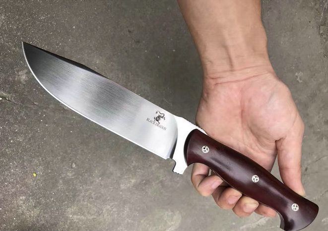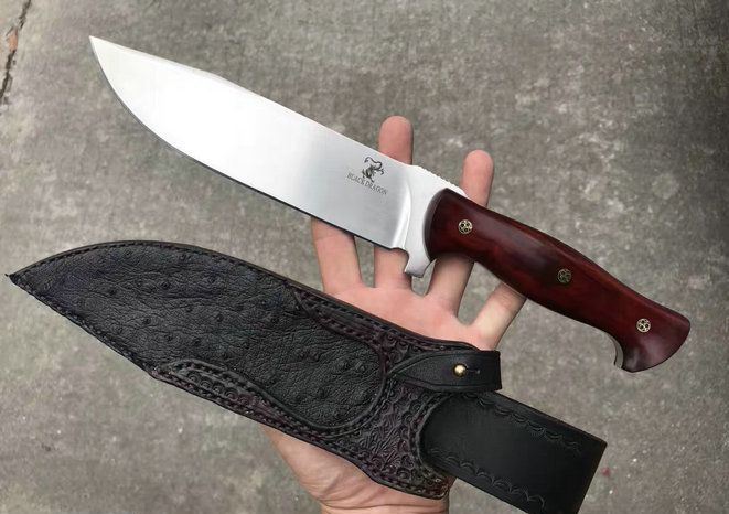黑龙红刺博弈中直刀 总长:31cm 刃长:18cm 刃厚:6MM 刃宽:4.2cm 钢材:进口DC53钢 硬度:60-61HRC 柄材:进口科檀木(皇帝木),精美纯铜花钉锁定 表面效果:纯收工拉直纹丝 热处理:真空深冷油淬热处理 皮套:意大利进口植鞣皮纯手工雕花缝线镶鸵鸟脚皮,收藏极好 开刃方式:手工二次开刃
