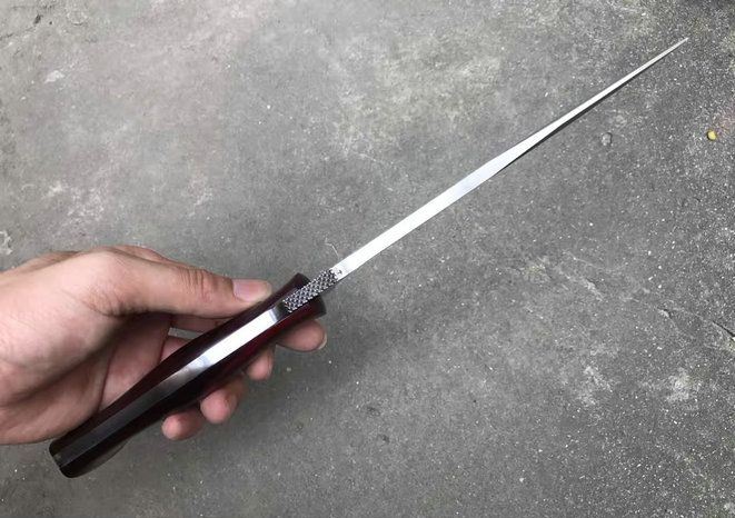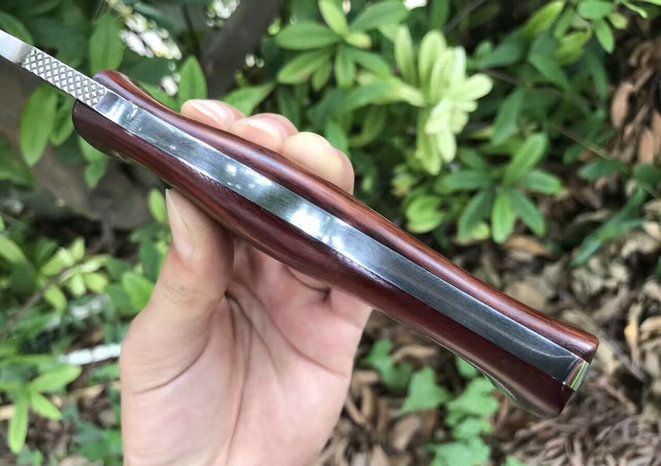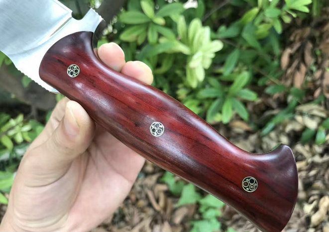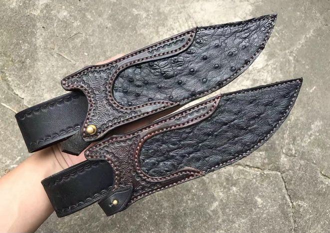 总长:31cm 刃长:18cm 刃厚:6MM 刃宽:4.2cm 钢材:进口DC53钢 硬度:60-61HRC 柄材:进口科檀木(皇帝木),精美纯铜花钉锁定 表面效果:纯收工拉直纹丝 热处理:真空深冷油淬热处理 皮套:意大利进口植鞣皮纯手工雕花缝线镶鸵鸟脚皮,收藏极好 开刃方式:手工二次开刃