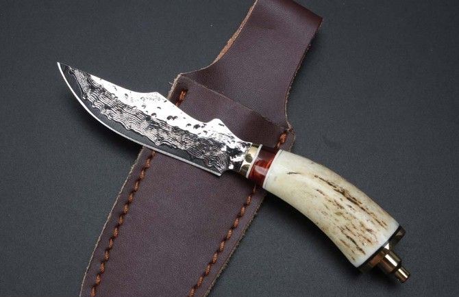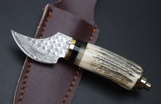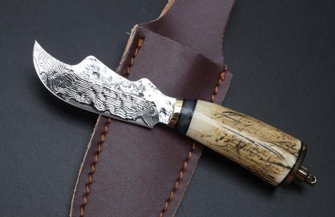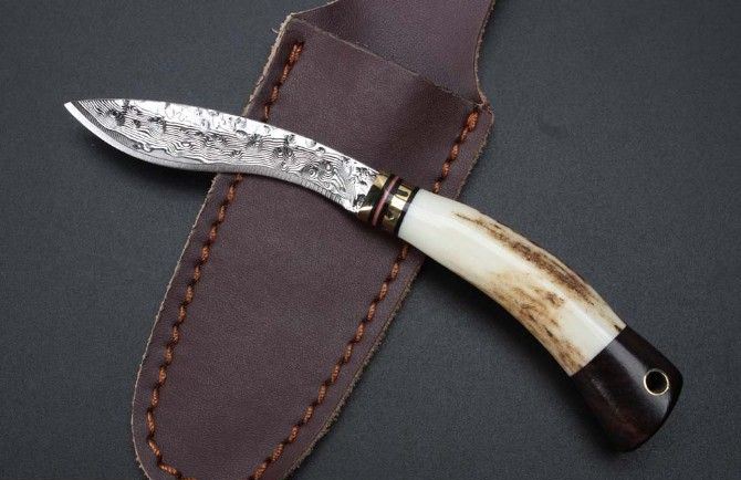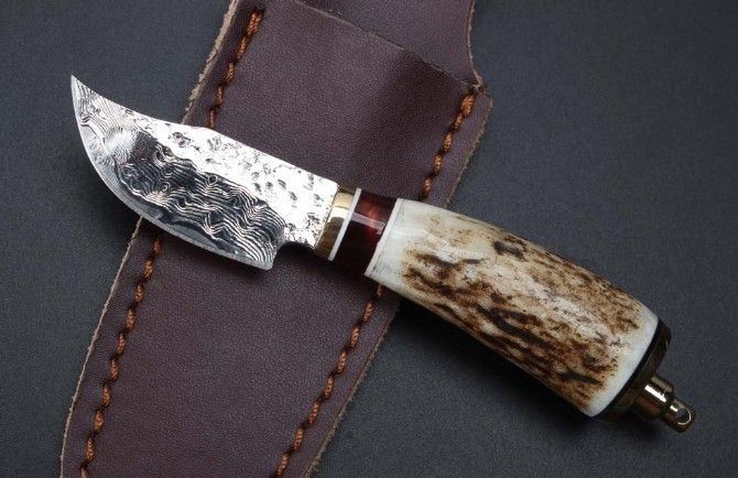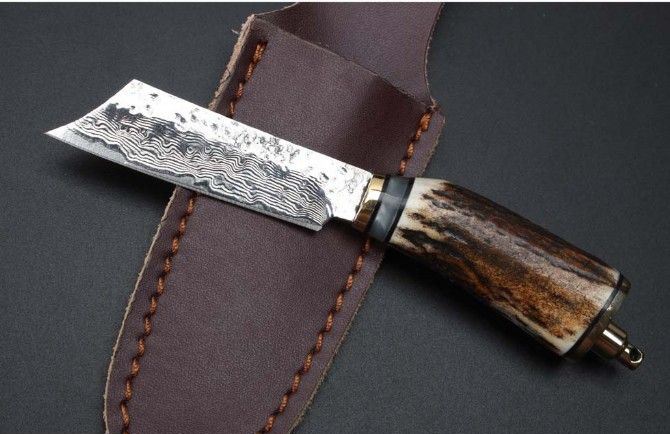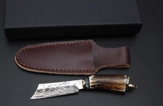 迷你大马士革小直刀 钢材:大马士革钢85层 全长:15cm 刃长:6.3cm 柄材:鹿角+黑檀木+黄铜 柄长:8.7cm 厚度:4mm 整体硬度:58-59HRC 配牛皮刀套