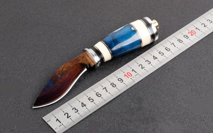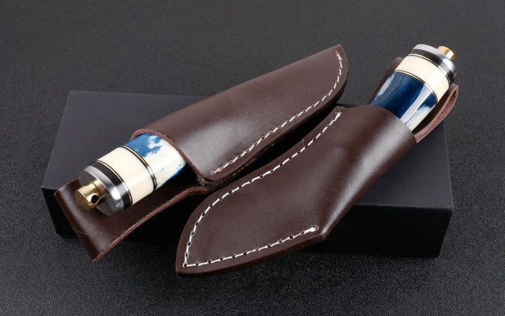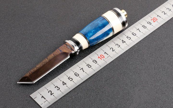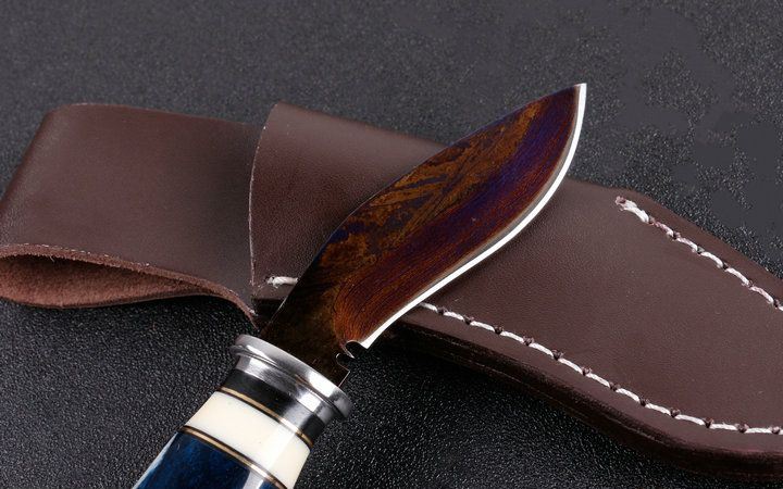 韩兵武士两款式直刀 全长:约17.5cm 刃长:7.5cm 柄长:9.5cm 刃宽:狗腿2.2cm,T头1.4cm(最宽处) 硬度:58HRC 刃厚:0.41cm 柄材:野生骆驼骨+护手铜头。 重量:265克(含包装) 刃材:锻打大马士革钢,新技术镀钛工艺。 表面:大马士革钢特有的花纹原色 其他:配高档礼品盒.全手工真皮套,尾部有撞击器,两款式分T头和小狗腿,下单注明. 大马士革钢花纹和把及颜色各异,以实物为准!