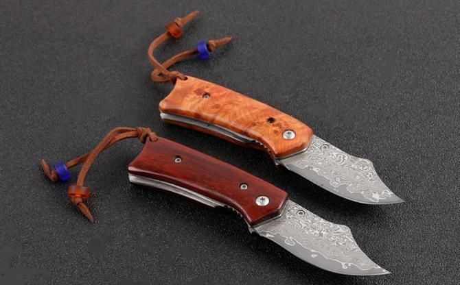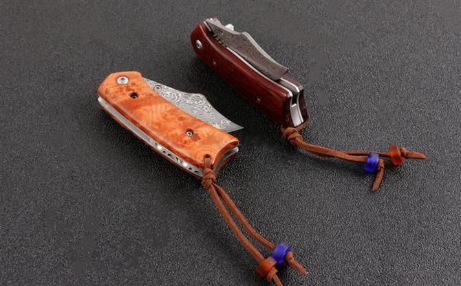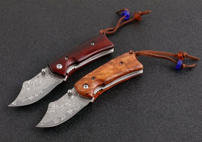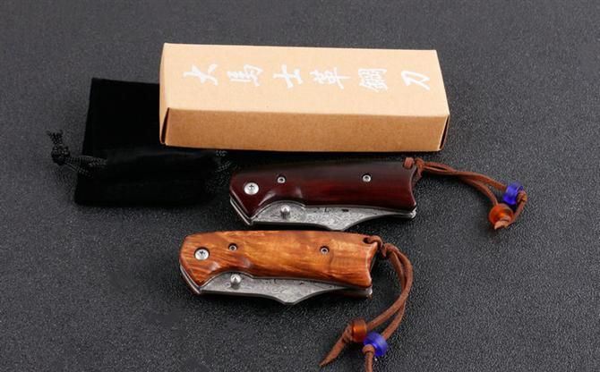 大马士革关公小折刀(微粒黄柄、影木柄) 全长:12.7cm 刃长:5.3cm 柄长:7.4cm 刃宽:2.5cm 刃厚:2.1mm 刃材:100%VG10大马士革钢 刀重:45g 重量:65g(含包装) 硬度:58-60HRC 表面:原有大马士革纹 柄材:天然老树微粒黄柄和影木两款式,木纹纹路清楚.下单要注明。 锁型:线锁。 其它:开合流畅,包装黄盒和黑绒布袋.