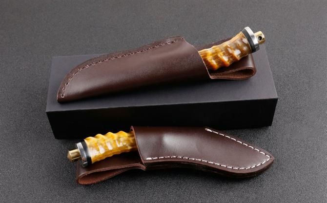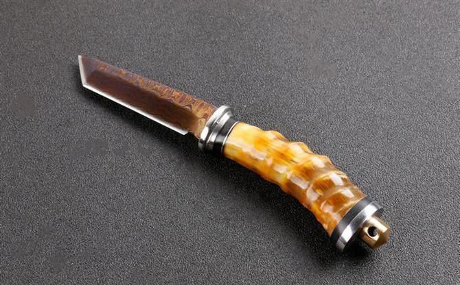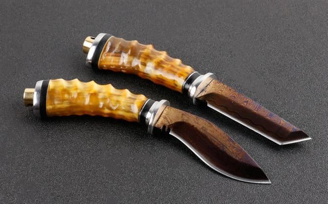 黄羊角大马士革双娇(T头版、小狗腿版) 全长:约16.5cm 刃长:8.0cm 柄长:8.5cm 刃宽:狗腿2.2cm,T头1.4cm(最宽处) 硬度:58HRC 刃厚:0.41cm 柄材:野生黄羊角+护手铜头。 重量:242克(含包装) 刃材:锻打大马士革钢,新技术镀钛工艺。 表面:大马士革钢特有的花纹原色 其他:配高档礼品盒.全手工真皮套,尾部有撞击器,两款式分T头和小狗腿,下单注明. 大马士革钢花纹和把及颜色各异,以实物为准!