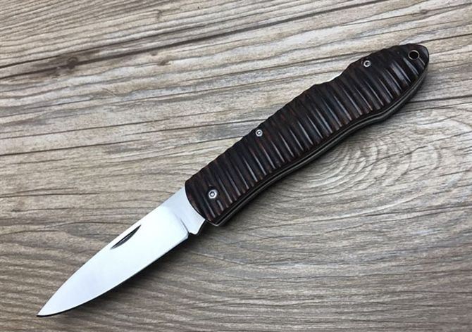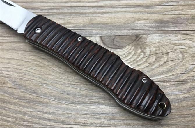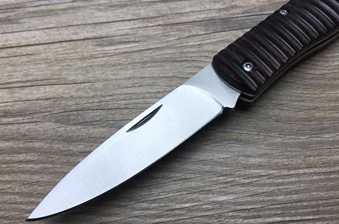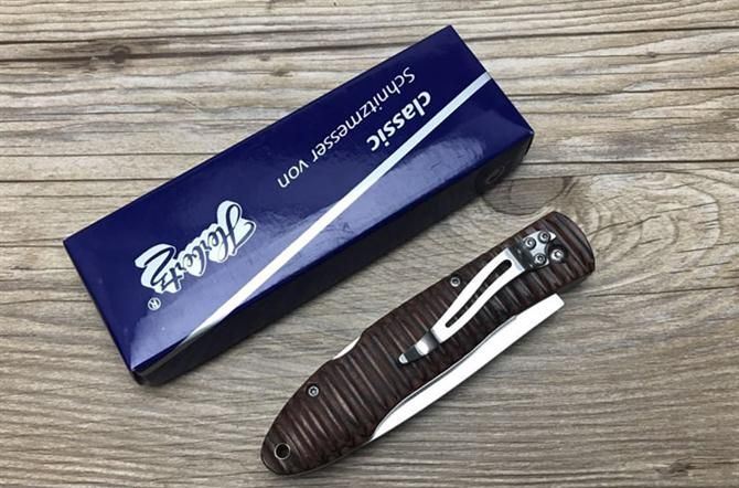 德国561217背锁折刀 全长:20cm 刃长:8.5cm 柄长:11.5cm 刃宽:1.9cm 刃厚:2.8mm 刃材:7Cr13Mov 重量:200g(含包装物) 硬度:58HRC 表面:沙光 柄材:进口彩木 锁型:一体线锁