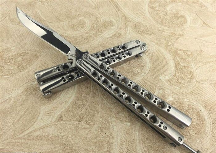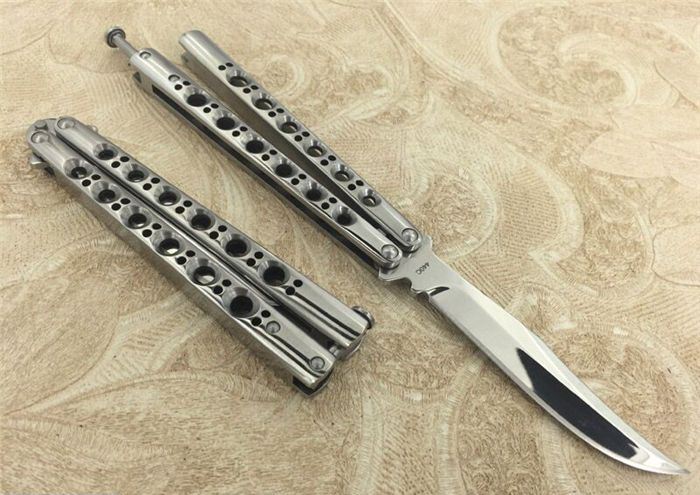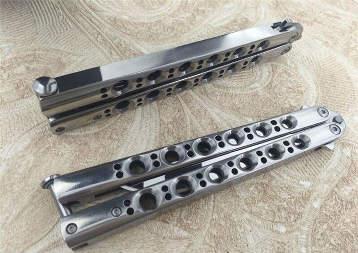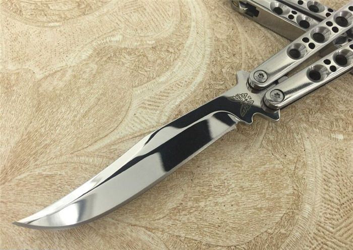THE ONE镜面款BM43蝴蝶甩刀 全长:24CM(打开) 刃长:9.5CM 刃厚:0.3CM 刃材料:进口440C 硬度:59-60 重量:150克 刀鞘:刺绣尼龙刀鞘 铸钢柄镂空,压弹出刀 THE ONE 镜面款BM43甩刀,由The one (唯一)精工打造,是现成BM系列精加工特制款式,经典BM43刃,一体柄型,刀刃选用高级440C钢,经精工细作的镜面抛光打造而成,螺丝扣锁都经过严格调配,小批量的精品甩刀