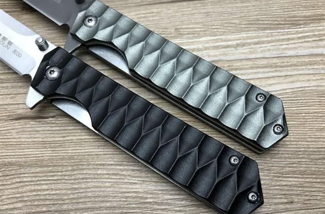 博斯顿必刹折刀(钛色刃、银色刃) 全长:20.2cm 刃长:9.0cm 柄长:11.2cm 刃厚:0.38cm 刃宽:2.2cm 刃材:5Cr13Mov 柄材:铝 硬度:57HRC 净重:205克(含包装) 锁定:线锁,内置轴承 表面处:沙光