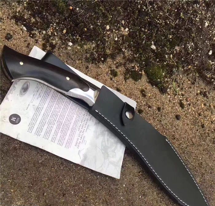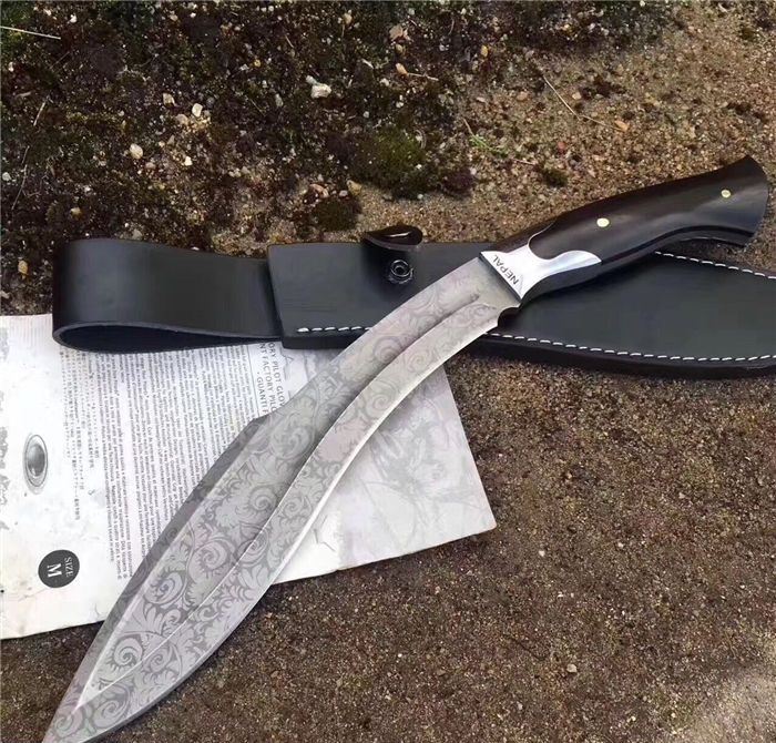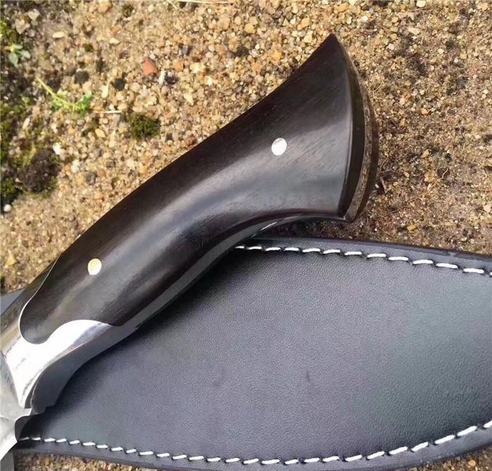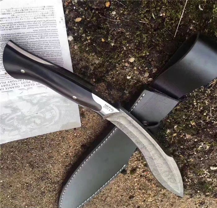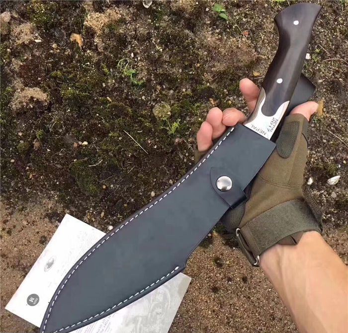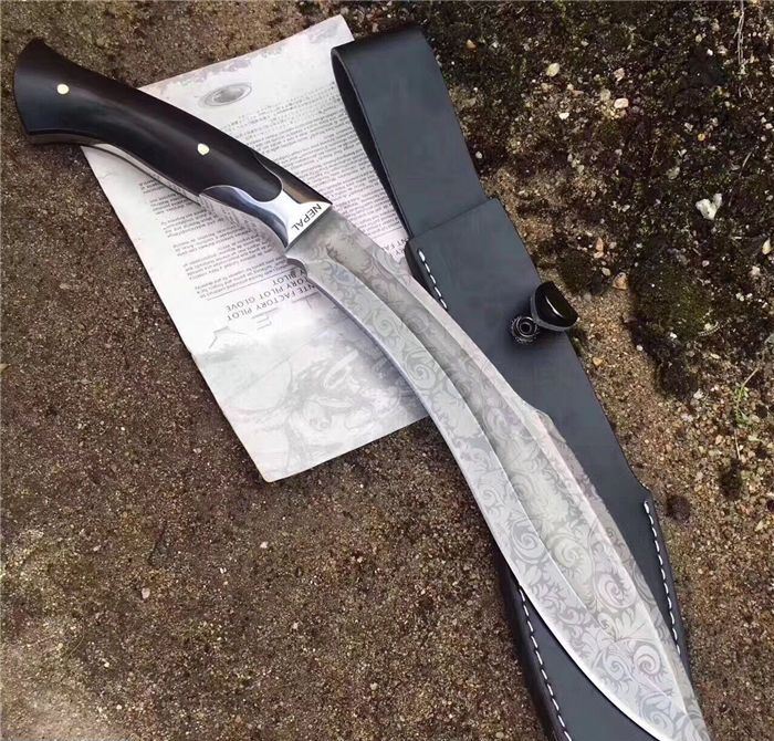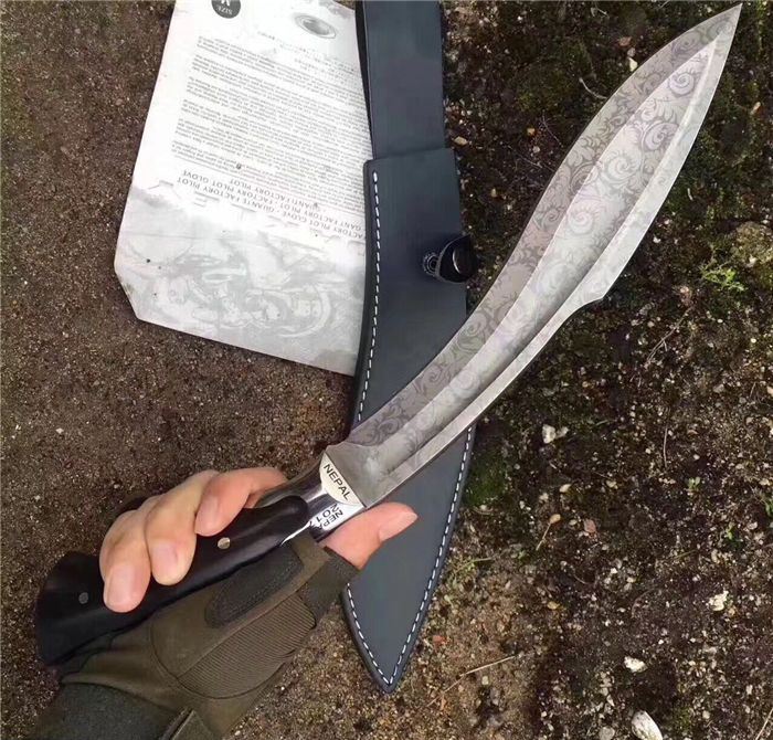 NEPAL激光纹狗腿刀 全长:40cm 刃长:26.5cm 柄长:13.5cm 厚度:6.0mm 硬度:58 钢材:5CR13MOV(锻打) 柄材:黑檀木 表面:砂光(一体龙骨) 重量:880g 刀鞘:皮刀鞘