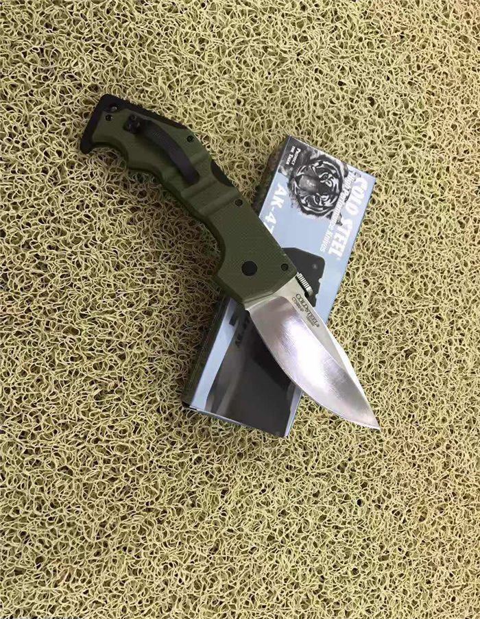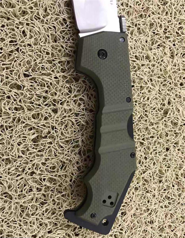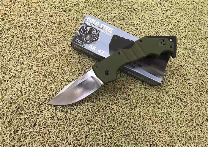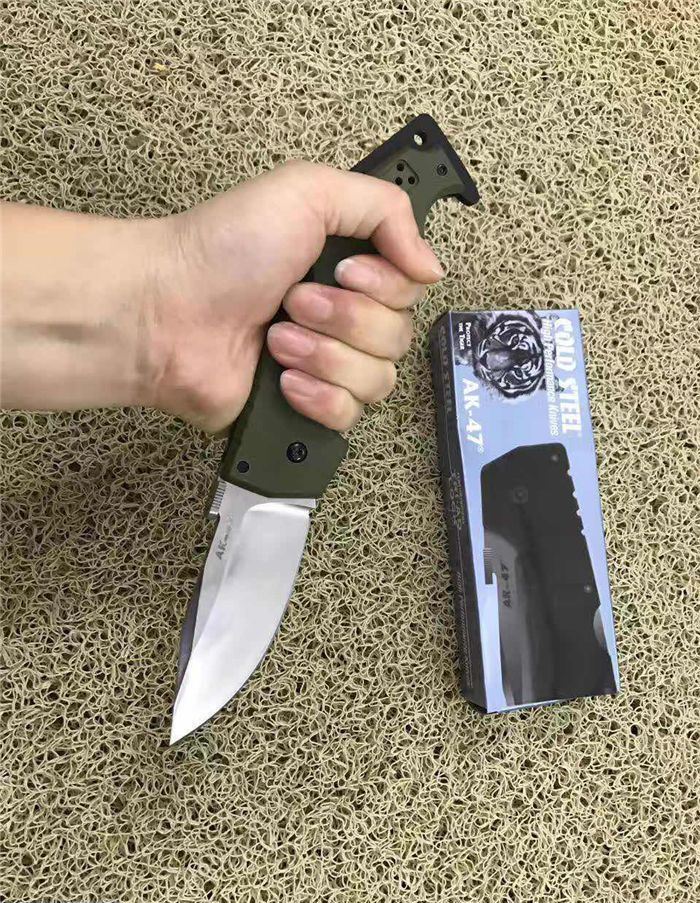 冷钢AK47背锁折刀(白版) 全长;22.8cm 刃长:8.8cm 柄长:14.0cm 刃厚:0.38cm 刃宽: 3.3cm 刃材: 5CR15MOV 柄材: 钢片+防滑G10手柄 硬度: 57HRC 净重;180克(含包装) 锁定:线锁 表面处:军绿色G10手柄 其他:原厂彩色盒