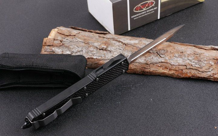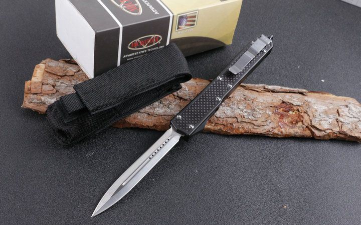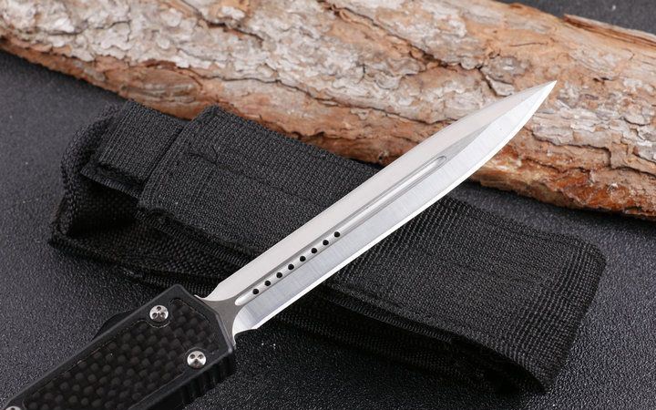 微技术圣蚂蚁碳纤维柄双锋直跳刀 全 长: 26.5cm (含尾锥长度) 刃 长: 10.8cm 刃 厚: 3mm 刃 材: D2 硬 度: 57HRC 总重量: 220.0克(含包装物) 表 面: 精细沙光(刀刃) 柄 材: 铝合金经CNC电话锣成型,极度精密,再精镶碳纤维手柄。 刀 鞘: 尼龙 锁 闭: 弹簧直出 备 注:带背夹