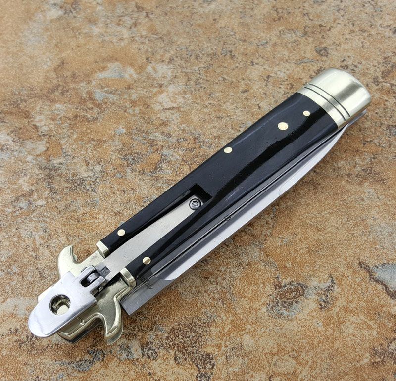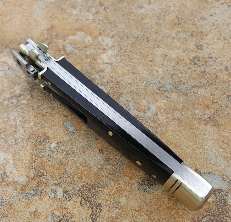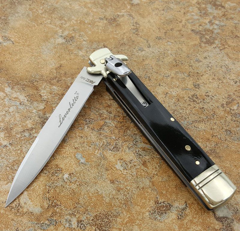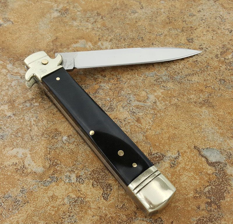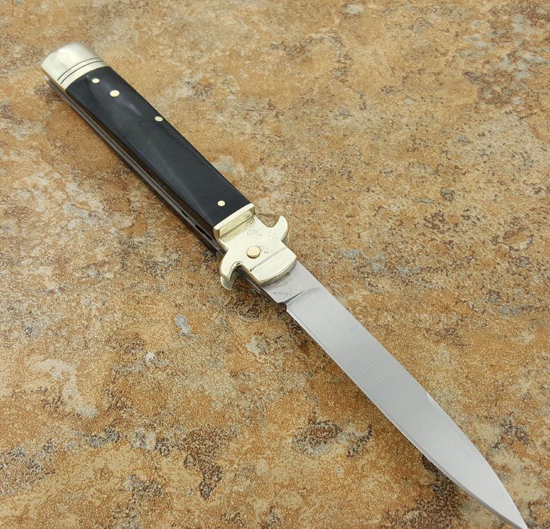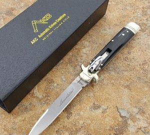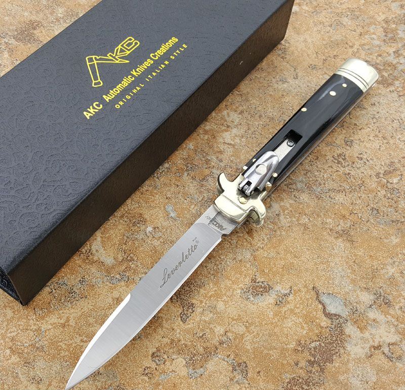 Plus款意大利Akc古典牛角柄跳刀 全长:23CM 刃长:9CM 刃厚:3MM 刃材料:D2高速工具钢 硬度:HRC58 柄材料:双黄铜护手+天然牛角 重量:50克(净重) 245(毛重) 附送原装精美礼盒