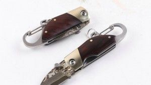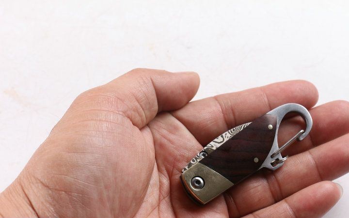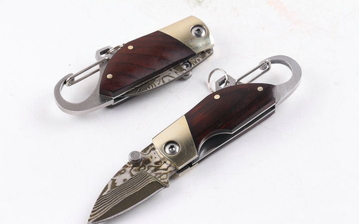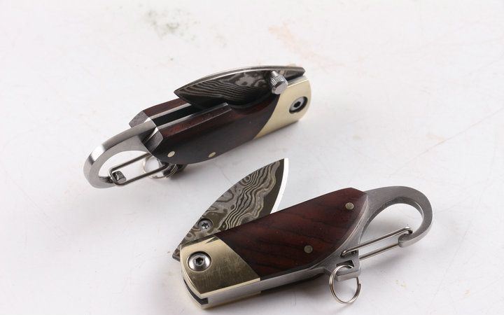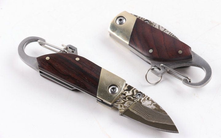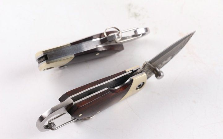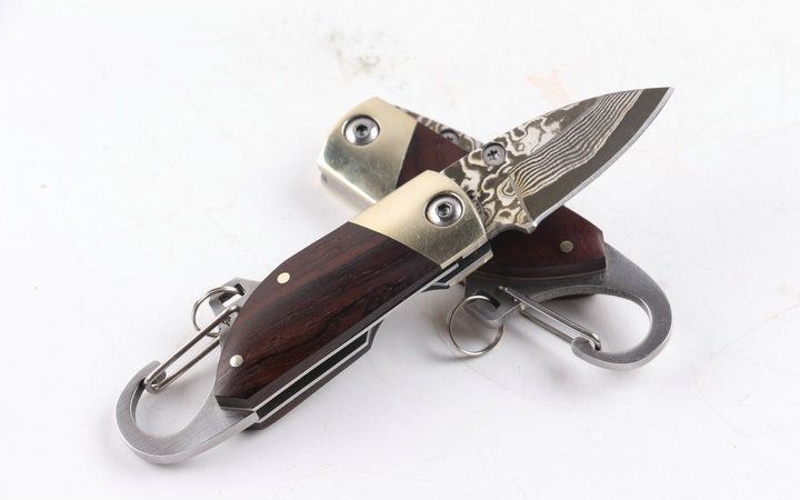 自由狼VG10大马士革小扣刀 全长:10.5cm 刃长:3.8cm 柄长:7.0cm 刃宽:2.9cm 刃厚:2.1mm 刃材:VG10大马士革钢 重量:40g(含包装) 硬度:56-57HRC 表面:VG10大马士革原纹 柄材:白铜头+天然黑檀木 锁型:侧锁 其他:白盒,出口装