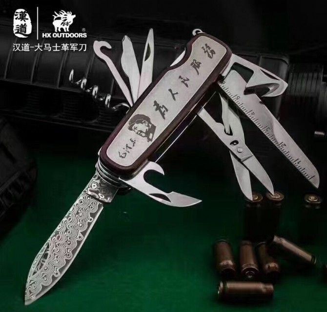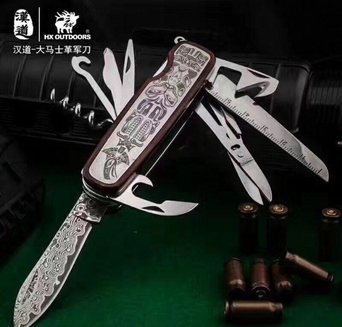 汉道大马士革军刀采用折刀的设计形式,以多用为设计核心;有主刀、剪刀、尺子&指甲锉、快递开子&手机支架、眼镜改锥、多用途钩子、红酒开瓶器、开罐器9个功能组件满足10余种功能用途;主刀采用大马士革钢打造,具有卓越的切割及使用性能;所有的功能组件均采用精冲工艺,制作精致;设计两种刀柄风格,镀合金全金属手柄、金属实木复合手柄,满足用户不同需求。