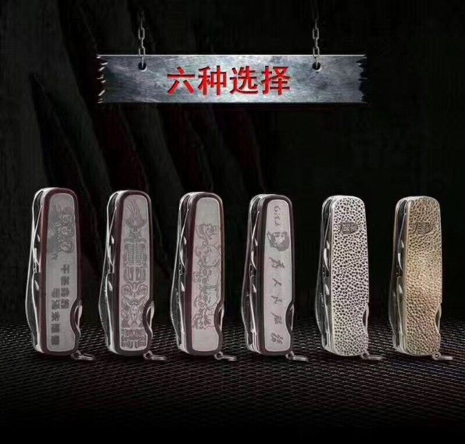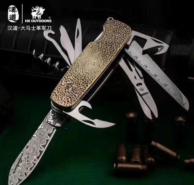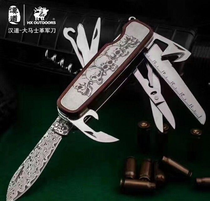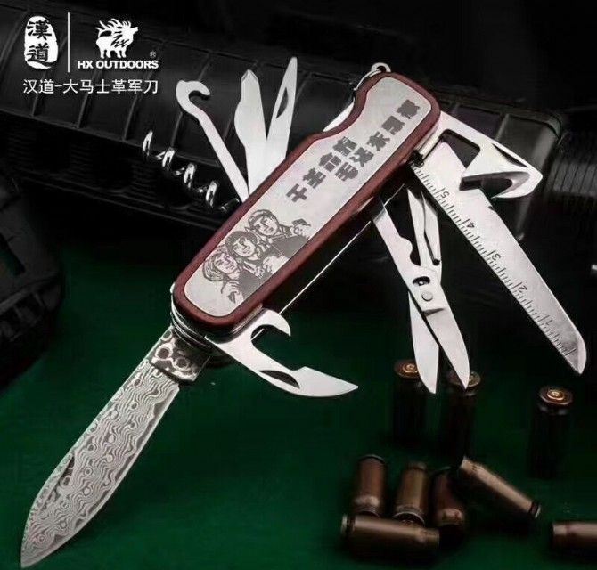 汉道大马士革军刀 全长:16CM 刃材:大马士革 硬度:58-60HRC 柄材:镀合金全金属手柄/金属实木复合手柄 汉道大马士革军刀采用折刀的设计形式,以多用为设计核心;有主刀、剪刀、尺子&指甲锉、快递开子&手机支架、眼镜改锥、多用途钩子、红酒开瓶器、开罐器9个功能组件满足10余种功能用途;主刀采用大马士革钢打造,具有卓越的切割及使用性能;所有的功能组件均采用精冲工艺,制作精致;设计两种刀柄风格,镀合金全金属手柄、金属实木复合手柄,满足用户不同需求。