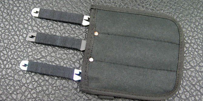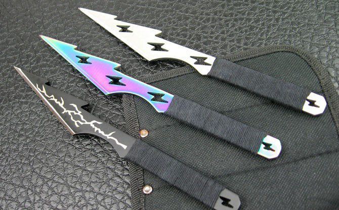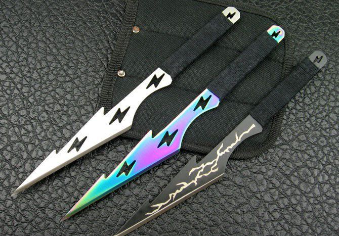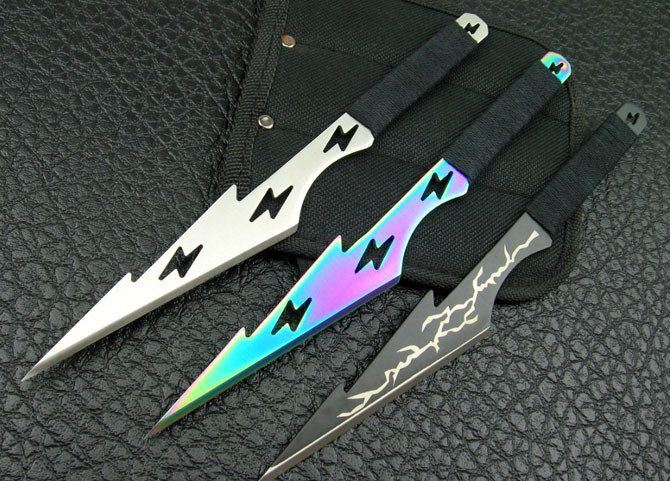 全 长:21cm 刃 厚:2.5mm 刃 材:420A 柄 材:绵绳 硬 度:56Hrc 表 面:砂光 刀 套:尼龙 净 重:180g 箭头型设计,中间镂空或是闪电图案。三种配色成一套(砂光、彩钛、电泳黑)。镖尖非常锐利,把玩时须注意安全!