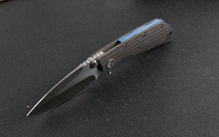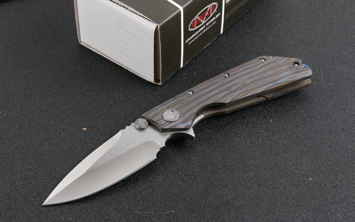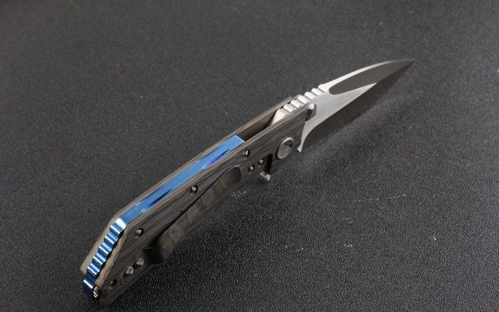 新版微技术DOC死亡接触火烧版折刀 全长:228mm 刃长:96mm 柄长:130mm 刃宽:36mm 刃厚:5.0mm 刃材:D2(深冷处理) 重量:260g 硬度:58-60HRC 表面:拉丝 柄材:手柄全TC4钛合金+火烧纹、底骨TC4钛合金蓝色阳极电镀处理。 刀夹:TC4钛合金 锁型:分体插入锁杆式线锁。 螺丝:所有螺丝420不锈钢、硬度HRC45、全CNC精雕加工。 结构:分体插入锁杆式线锁结构、锁刀接触镶嵌合金粒、陶瓷定位珠、内置平面滚针轴承垫片。 其他:配彩合和出世纸