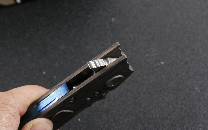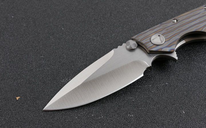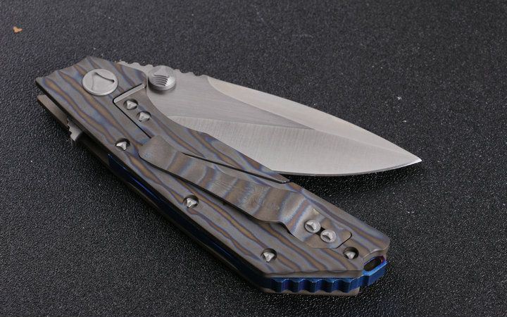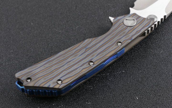全长:228mm 刃长:96mm 柄长:130mm 刃宽:36mm 刃厚:5.0mm 刃材:D2(深冷处理) 重量:260g 硬度:58-60HRC 表面:拉丝 柄材:手柄全TC4钛合金+火烧纹、底骨TC4钛合金蓝色阳极电镀处理。 刀夹:TC4钛合金 锁型:分体插入锁杆式线锁。 螺丝:所有螺丝420不锈钢、硬度HRC45、全CNC精雕加工。 结构:分体插入锁杆式线锁结构、锁刀接触镶嵌合金粒、陶瓷定位珠、内置平面滚针轴承垫片。 其他:配彩合和出世纸