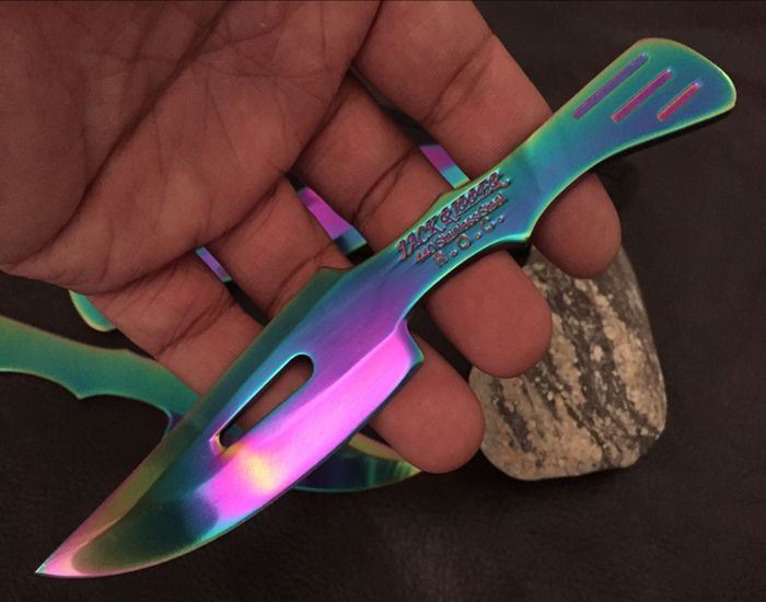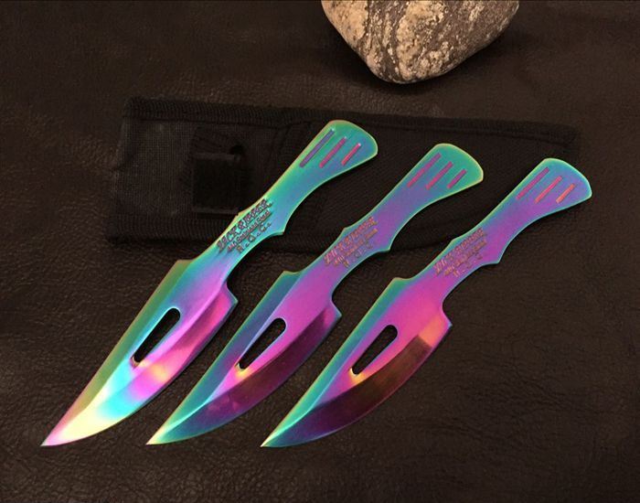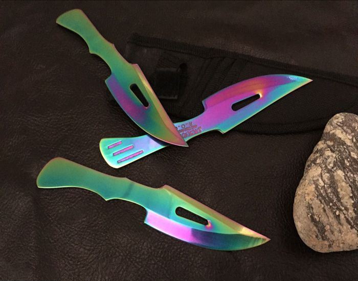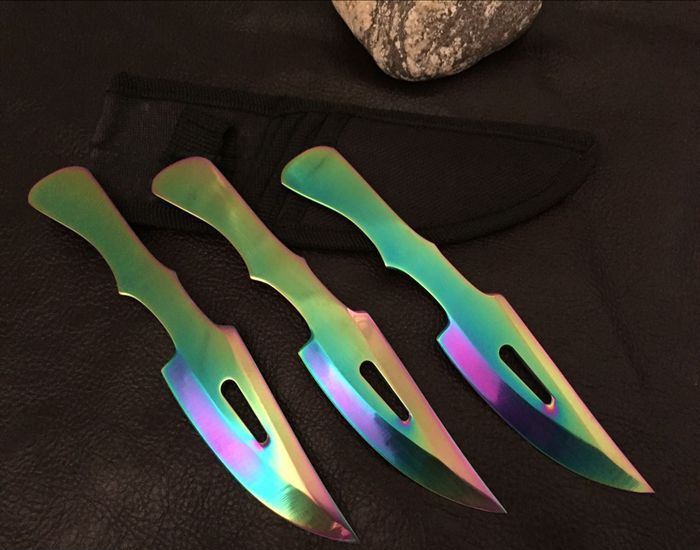 鹰眼彩钛单刃飞刀三支装 全长:15.5cm 刃长:8cm 刃厚:0.3cm 材料:高级不锈钢 硬度:54-56 重量:48克/支, 一套3支装
