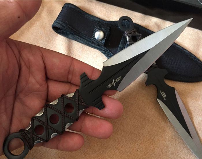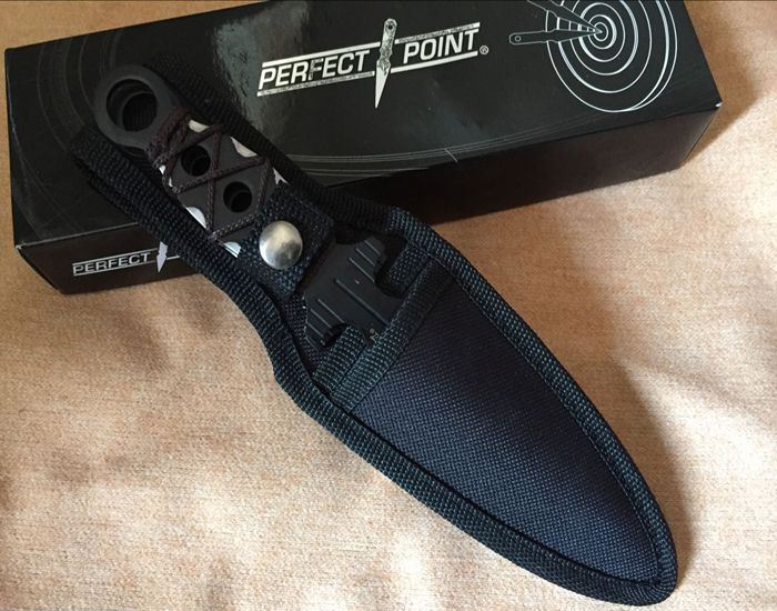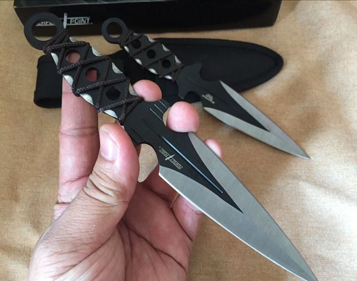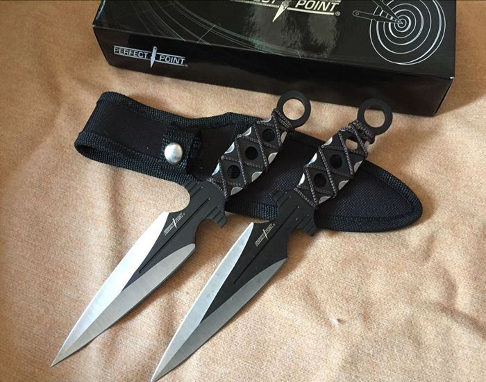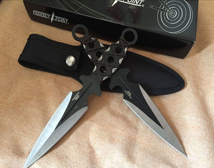 穿心飞刀两只装 全长:20.5CM 刃长:10CM 刀厚:0.25CM 最宽:2.9CM 柄材料:一体 刃材料:420不锈钢 表面:喷漆 刀鞘:尼龙(两支)