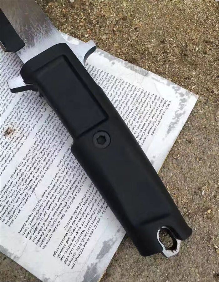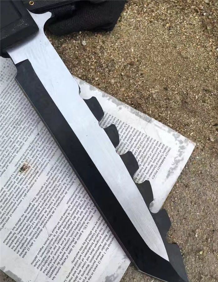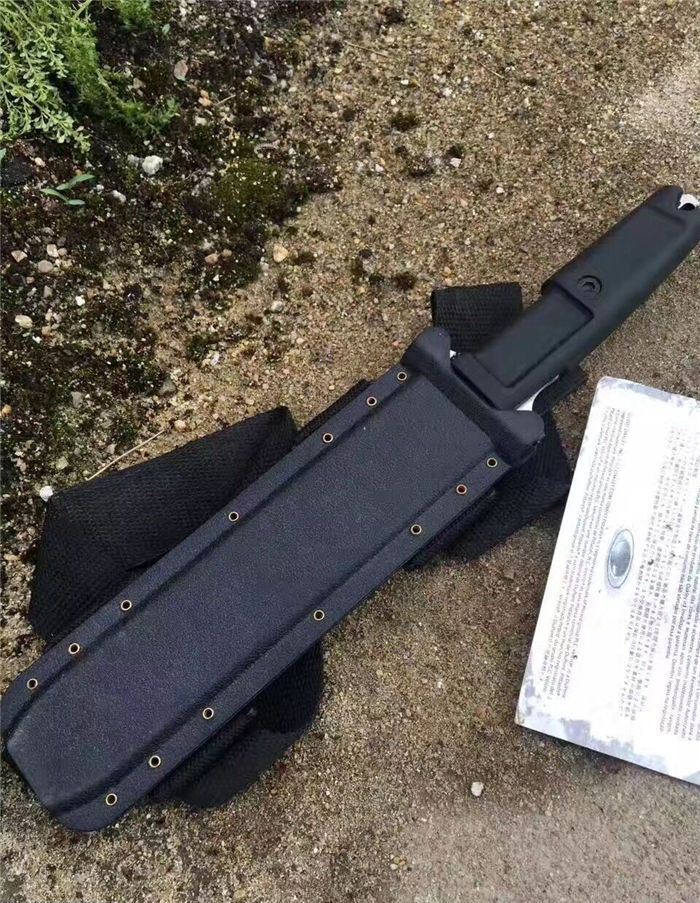 全 长: 31cm 刃 长: 18cm 刃 厚: 6mm 刃 材: 8CR13MOV 硬 度: 58HRC 表 面: 拉丝黑钛 柄 材: 橡塑 刀 鞘: ABS