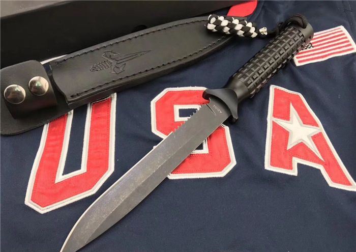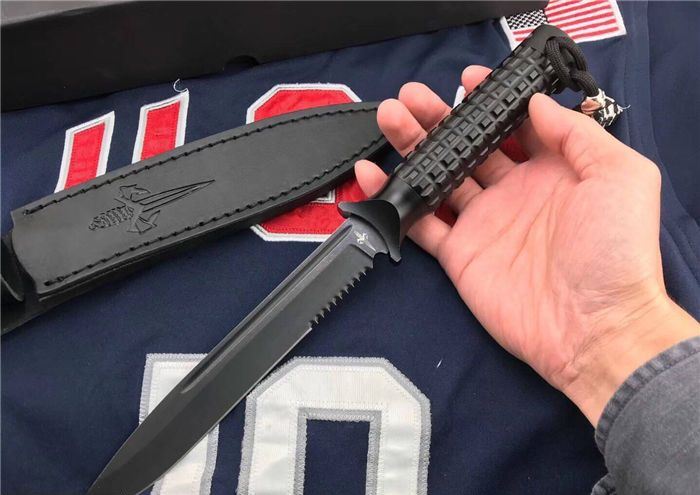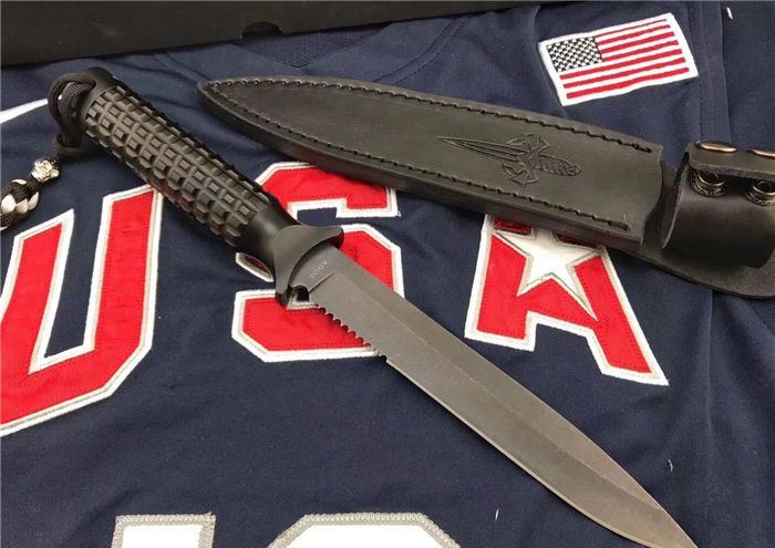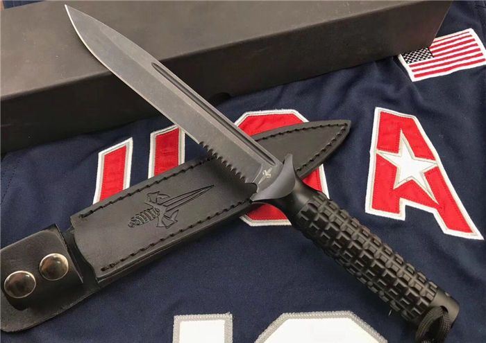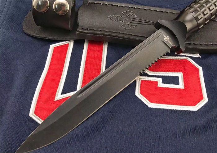 Microtech美国微技术/大剑标双刃黑色半齿 全长:31.5cm 刃长:18cm 刃厚:0.35cm 柄长:13.5cm 刃材:9Cr18M0V 表面:黑钛 硬度:58-60HRC 柄材:铝 鞘材:皮套 总重:500克(含包装) 品质:高品质 产地:国内代工 刃口非常锋利
