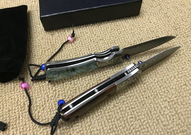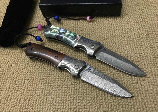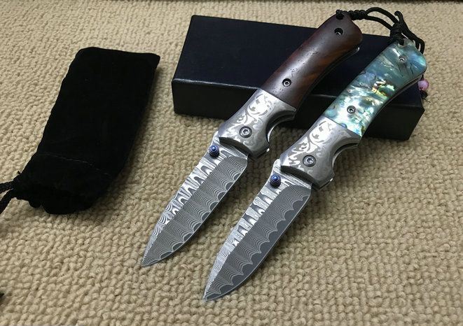 大师兄大马士革折刀 全 长:16.5cm 刃 长:6.5cm 柄 长:9.5cm 刃 厚:2.0mm 刃 材:大马士革钢 硬 度:57HRC 刀 柄:天然鲍贝。酸枝木 表 面:大马士革花纹 锁定方式:侧锁 重 量:170.0克 备 注:礼品盒