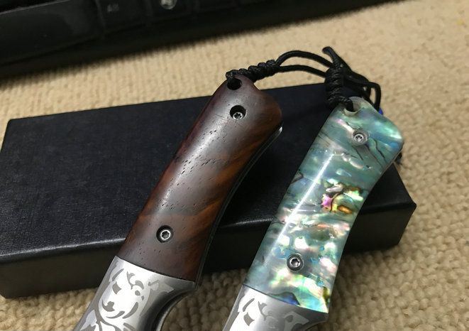 全 长:16.5cm 刃 长:6.5cm 柄 长:9.5cm 刃 厚:2.0mm 刃 材:大马士革钢 硬 度:57HRC 刀 柄:天然鲍贝。酸枝木 表 面:大马士革花纹 锁定方式:侧锁 重 量:170.0克 备 注:礼品盒