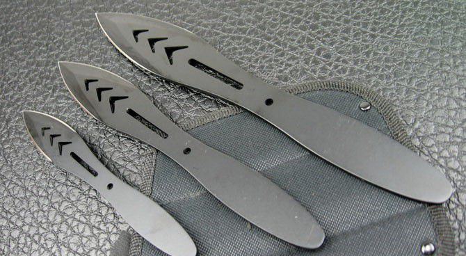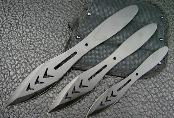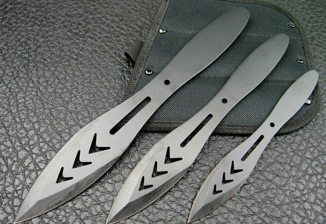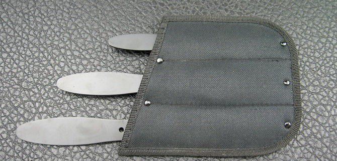 全钢大头飞镖A-54333-10(三支一套) 全 长:16.5cm/21.5cm/25.3cm 刃 厚:2.5mm 刃 材:420A 硬 度:56HRC 表 面:电泳 刀 鞘:尼龙 重 量:250g 该飞镖重心在前,飞行稳定,穿透力强!
