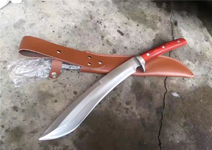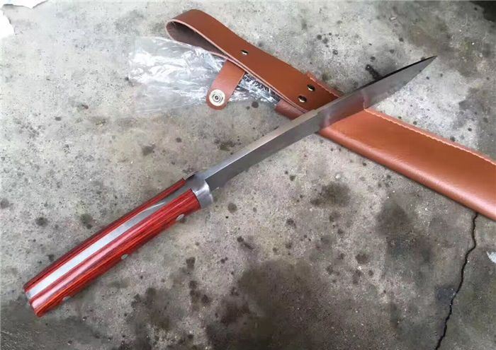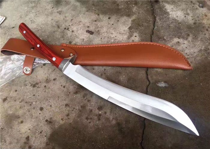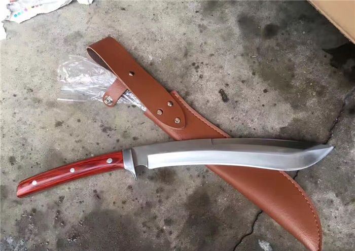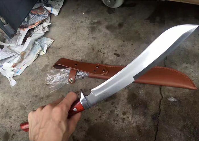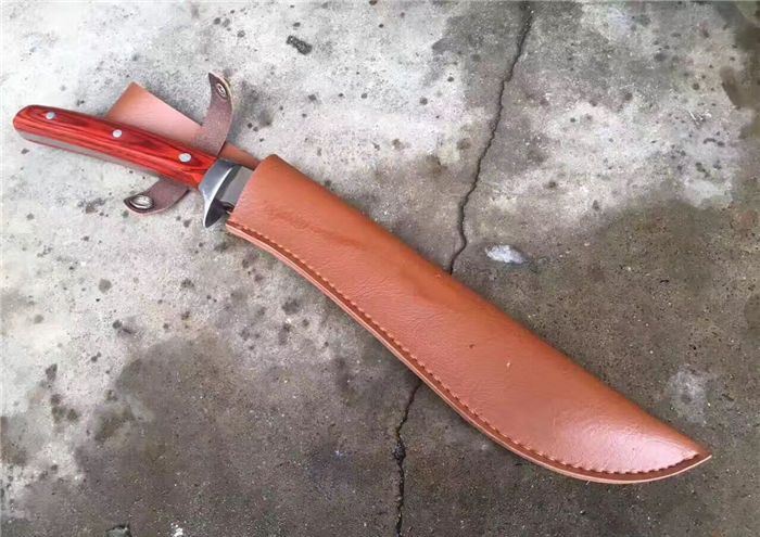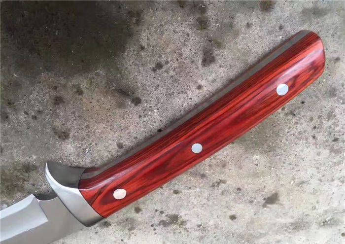 大号淑女木柄加长版狗腿刀 全 长:35厘米 柄 长:10厘米 刃 长:25厘米 厚 度:0.8厘米 宽 度:2厘米 刃 材:高碳钢 硬 度:58-60 刀 面:镜面 柄 材:牛骨 刀 鞘:头层加厚牛皮