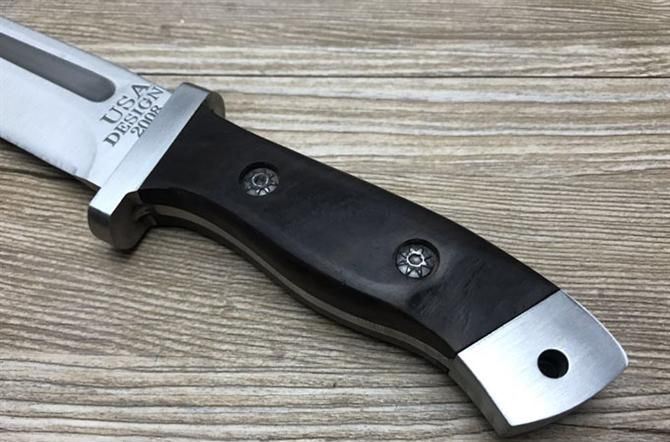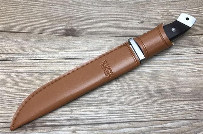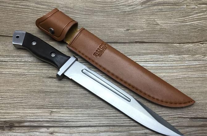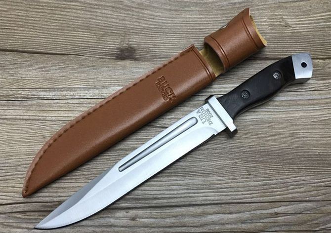 加长巴克BUCK2008猎刀 全长:29.8cm 刃长:19cm 柄长:10.8cm 厚度:3.5mm 硬度:57HRC 钢材:3CR13 柄材:ABS橡胶 总重量含包装:280g 刀鞘:尼龙套
