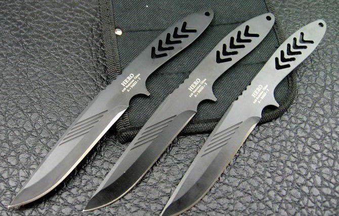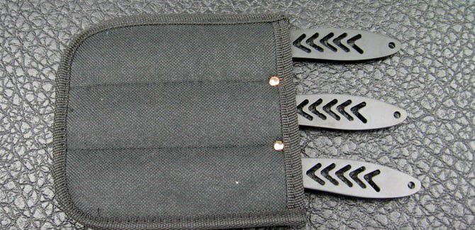 全钢飞刀 A-54333-2(三支一套) 全 长:18.8cm 刃 厚:2.5mm 刃 材:420A 硬 度:56Hrc 表 面:电泳 刀 套:尼龙 净 重:230g 飞刀的造型,经典别致。单面开刃锋利,还可以当小刀使用!