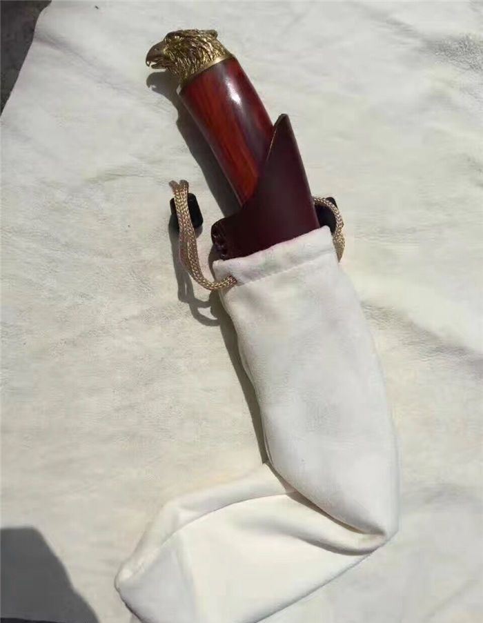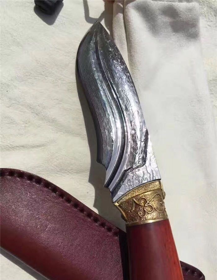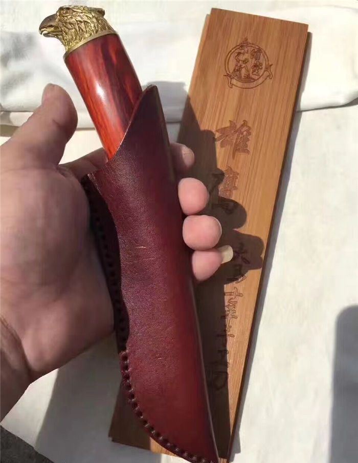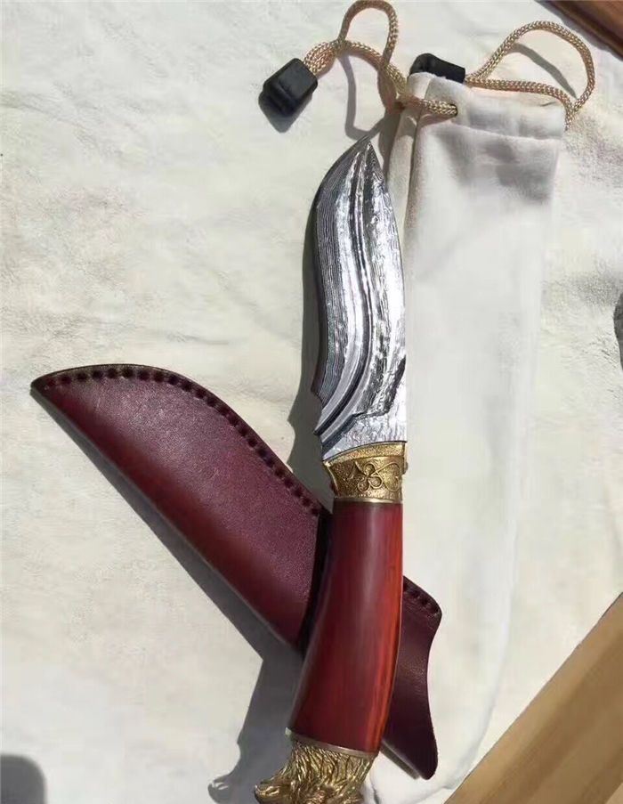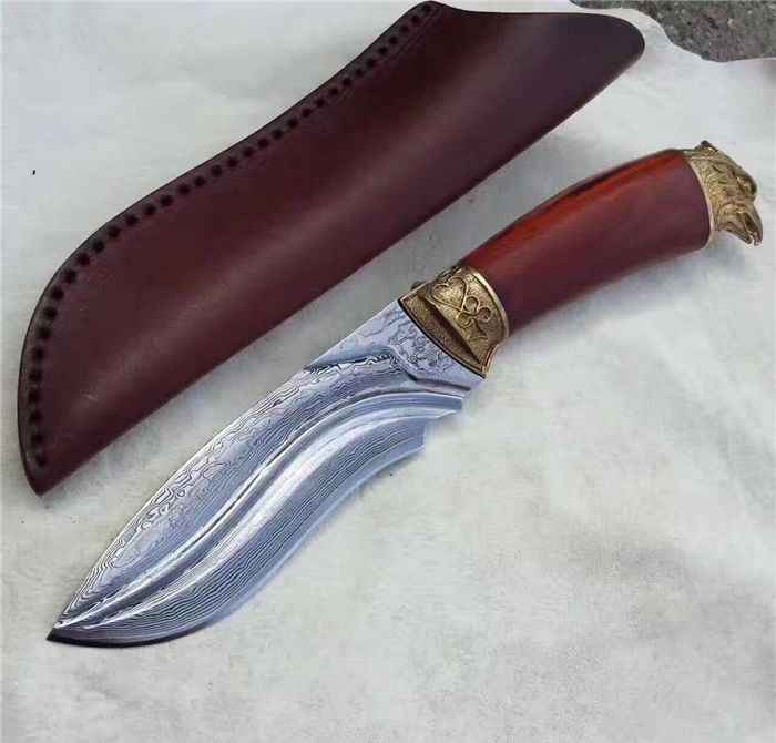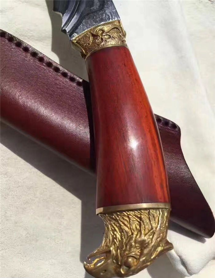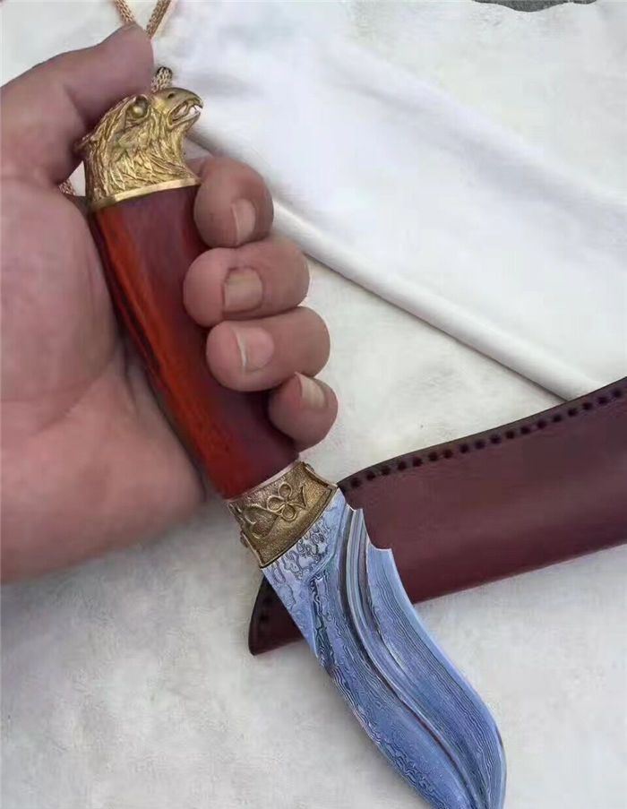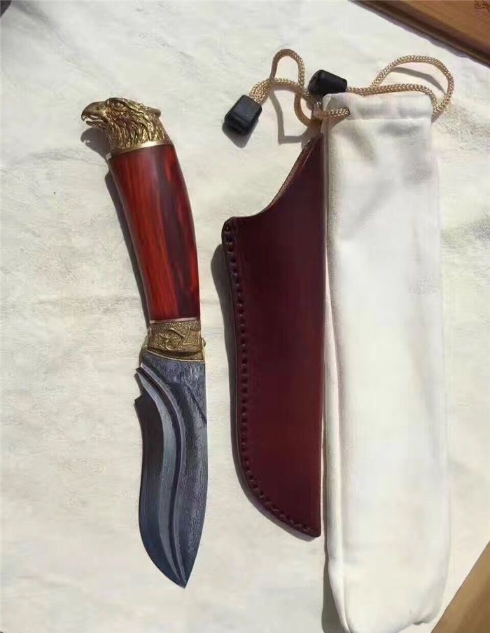 大漠雄鹰大马士革直刀 全长:230mm 刃长:120mm 刃宽:3.5mm 刃厚:0.42mm 刃材:大马士革钢 硬度:59-60HRC之间 刀套:牛皮手工刀套 刀柄:科檀木手柄、手工雕刻精铸鹰头