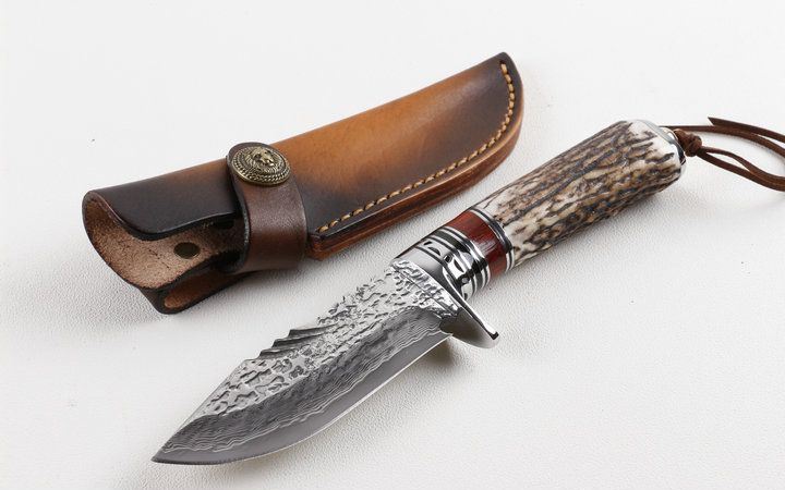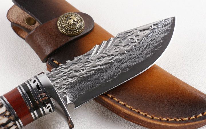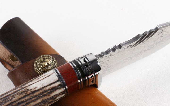 鹿角斗士大马士革直刀 全 长:22.5cm 刃 长:10.8cm 柄 长:11.7cm 刃 厚:4.7mm 刃 材:VG10大马士革 硬 度:58HRC 总 重:430克 净 重:228克 表 面:大马士革原有纹 柄 材:超镜光钢头护手+天然鹿角+微粒黄檀木 刀 鞘:意大利真皮套+黑色礼品盒