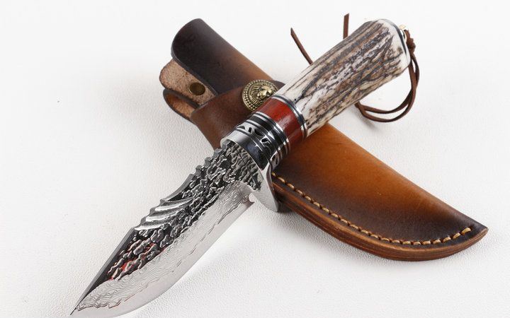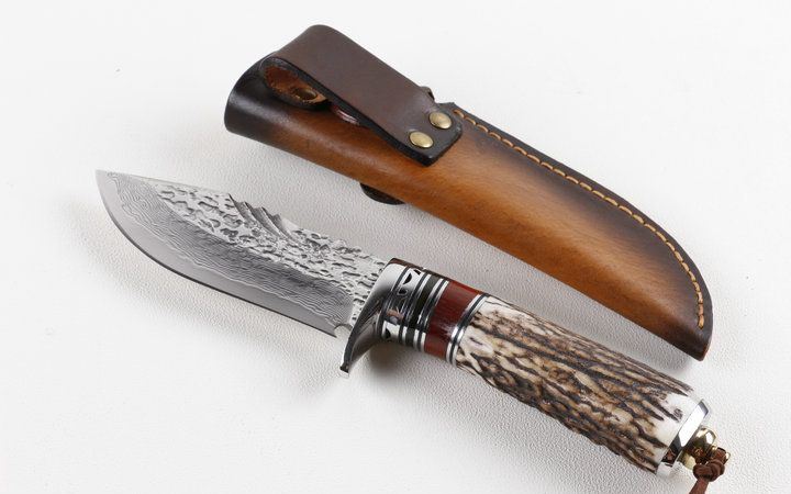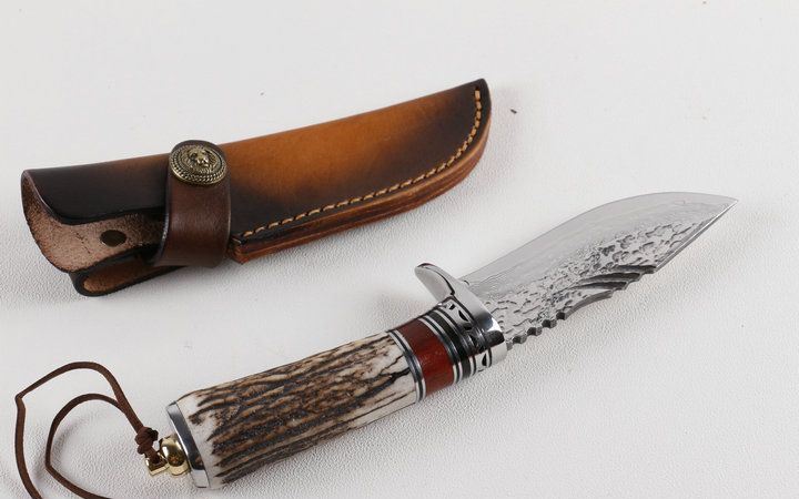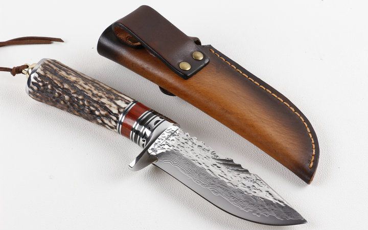 全 长:22.5cm 刃 长:10.8cm 柄 长:11.7cm 刃 厚:4.7mm 刃 材:VG10大马士革 硬 度:58HRC 总 重:430克 净 重:228克 表 面:大马士革原有纹 柄 材:超镜光钢头护手+天然鹿角+微粒黄檀木 刀 鞘:意大利真皮套+黑色礼品盒